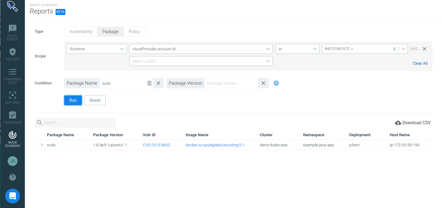 ]3 Report on Sysdig Secure with running containers that contain the affected sudo version.