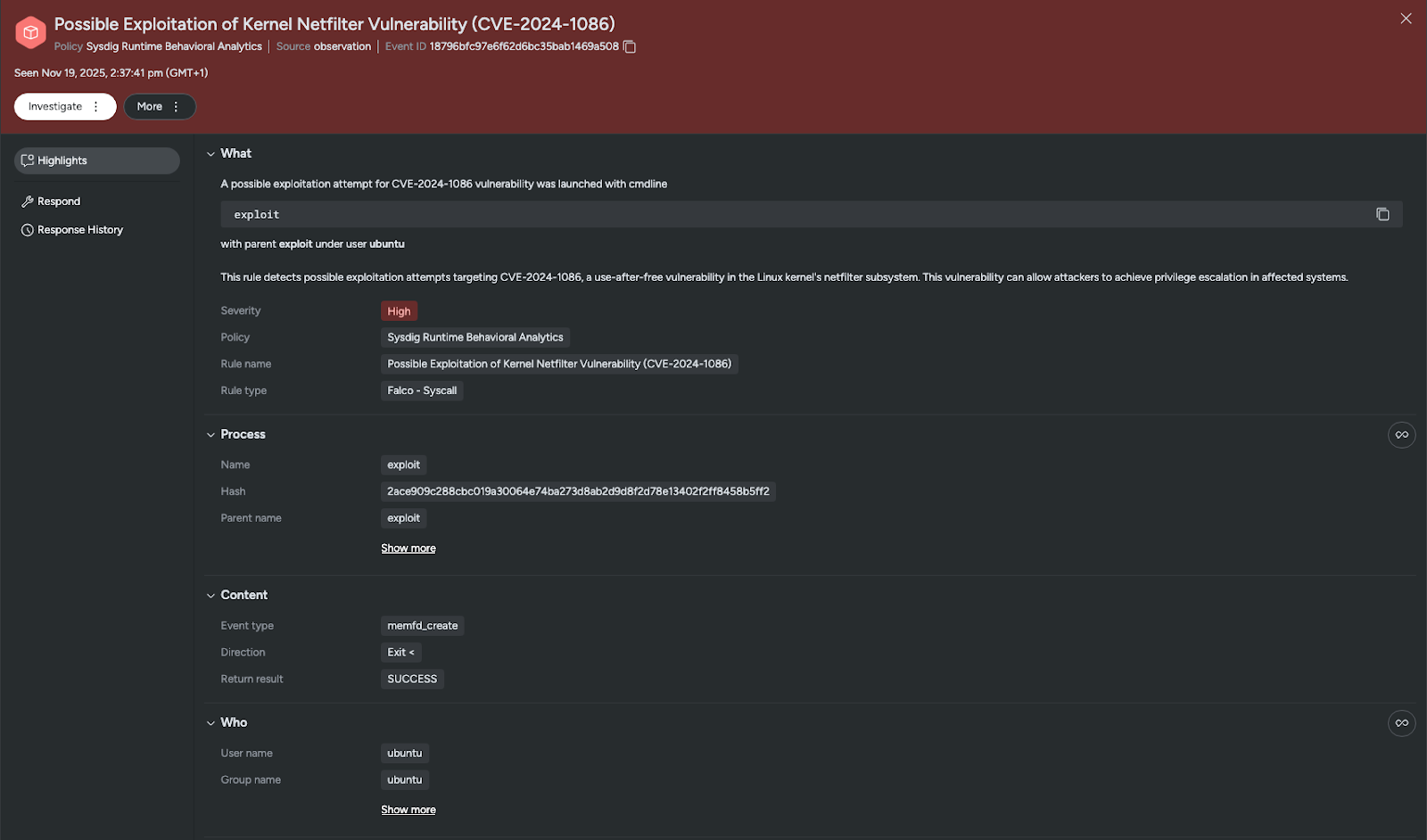Sysdig Secure includes out-of-the-box detection for CVE-2024-1086 with the rule “Possible Exploitation of Kernel Netfilter Vulnerability (CVE-2024-1086)” in the Sysdig Runtime Behavioral Analytics policy.