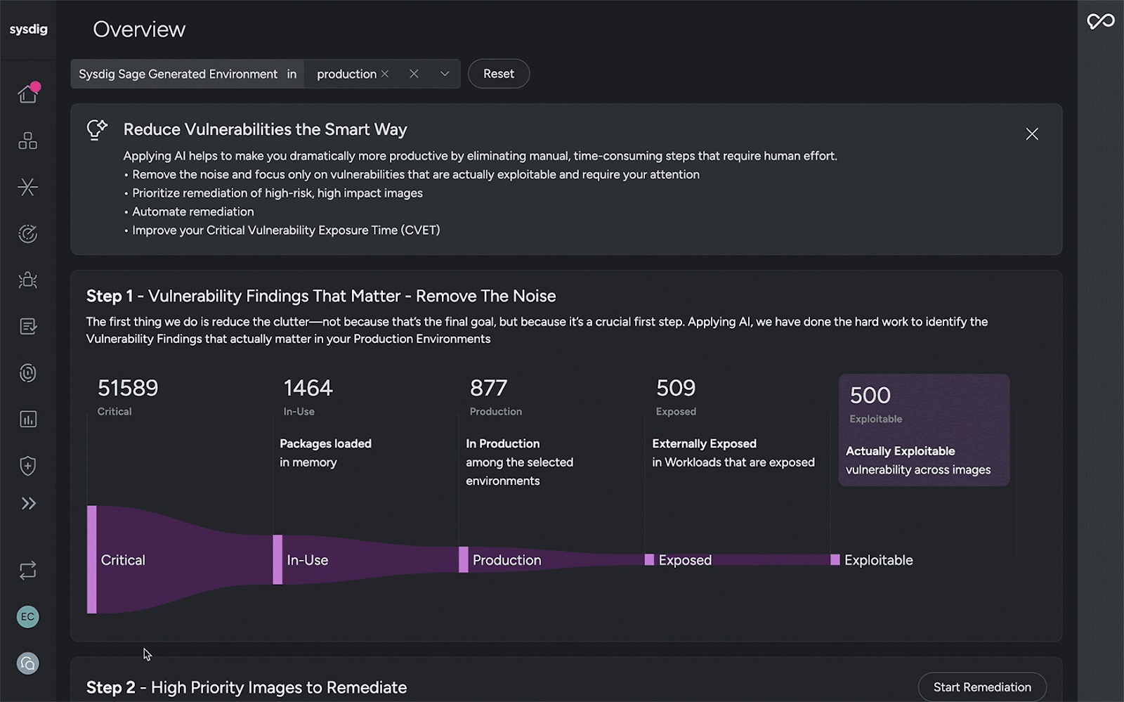 With Sysdig Sage™, our AI cloud security analyst, Sysdig has helped security teams investigate, respond, and reduce risk across the cloud security lifecycle. We’ve moved now into agentic cloud security, introducing autonomous agents that analyze your environment, understand your business, and take action with minimal human effort – starting with vulnerability management as the first use case.