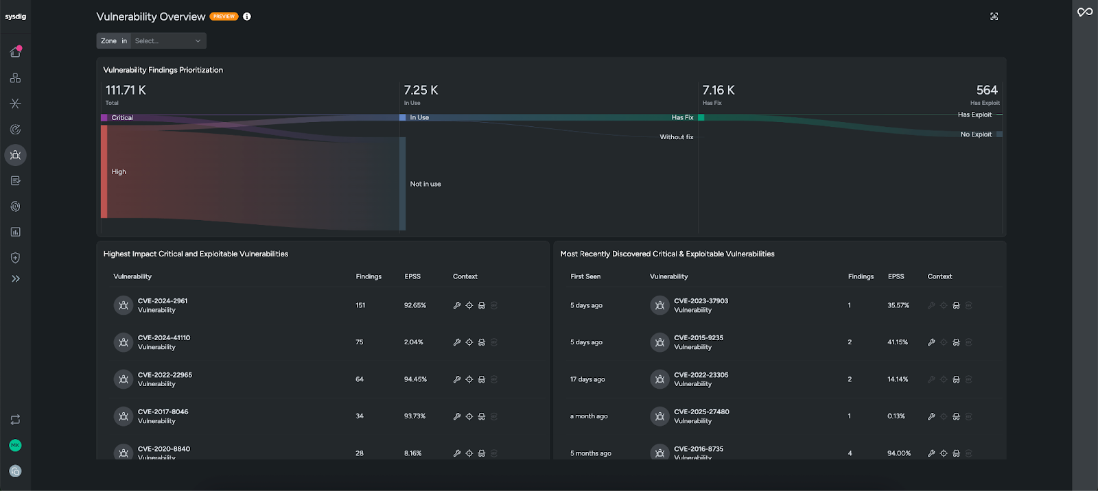 When you open Sysdig’s Vulnerability Overview, you won’t be overwhelmed by thousands of CVEs. Instead, Sysdig highlights the vulnerabilities that matter most, focusing on those that are tied to packages running in production (in use), have a fix, and have a known exploit. This runtime-aware prioritization cuts through the noise, helping teams greatly reduce their scope and focus on the issues that require immediate action.