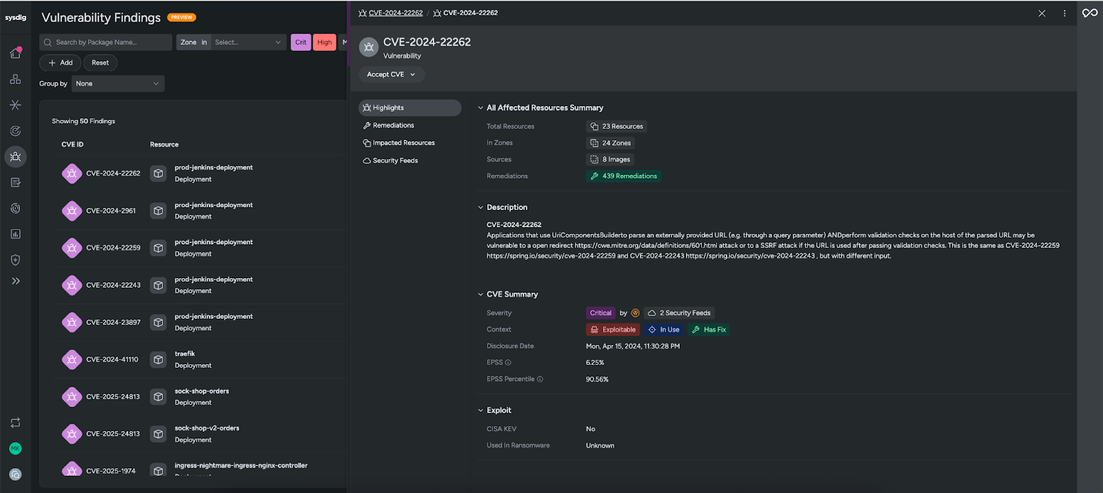 The CVE360 view gives complete context on all instances of this CVE throughout your environment so you can assess the scope and impact of the CVE at a glance. Relevant context like the total resources impacted, sources, and remediations helps you prioritize and understand if this is something that needs to be fixed.