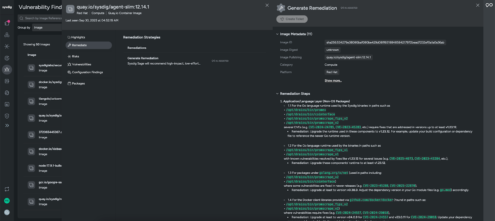 When it comes to remediation, Sysdig provides actionable guidance. For container images, our AI cloud security analyst, Sysdig Sage™, generates low effort remediations that will have the greatest impact on risk reduction. Sysdig Sage turns traditional vulnerability management workflows into agentic processes, generating step-by-step instructions to remediate vulnerabilities on the container image. From here, you can automatically create a ticket and pass it along to your engineering team to remediate, which includes all of the context they will need.