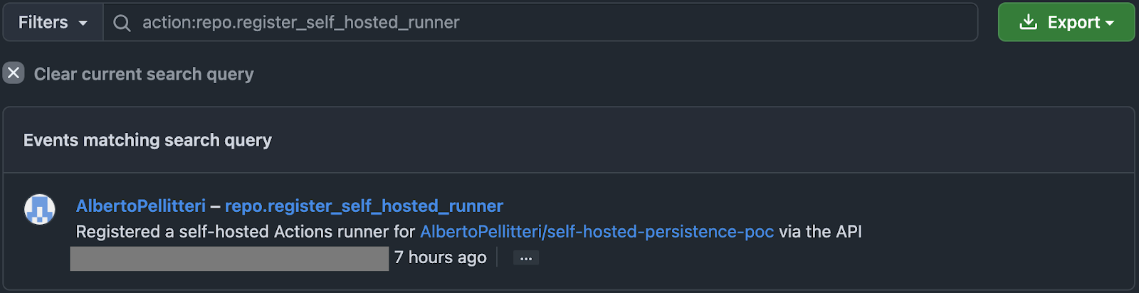 echo "Total runners: $RUNNER_COUNT"Additionally, organizations should query GitHub audit log events, specifically repo.register_self_hosted_runner, to identify any unauthorized runner registrations that may have occurred in the past. Runner information is also available directly in a repository's Settings panel under the Runners page in the Actions section.