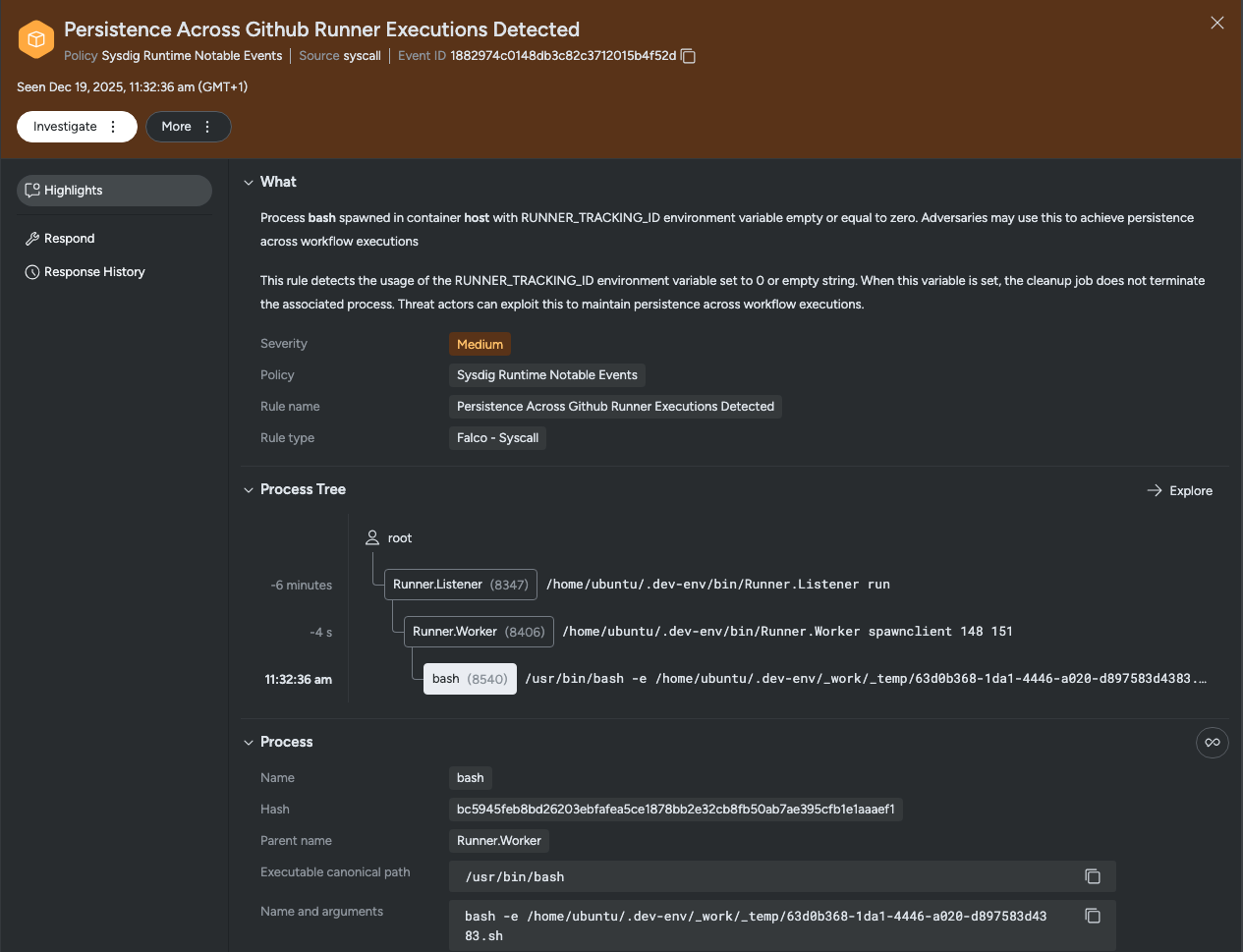 Sysdig provides the Persistence Across Github Runner Executions Detected rule as part of the Sysdig Runtime Notable Events policy. This rule triggers when processes attempt to persist beyond the normal lifecycle of a GitHub Actions job execution.