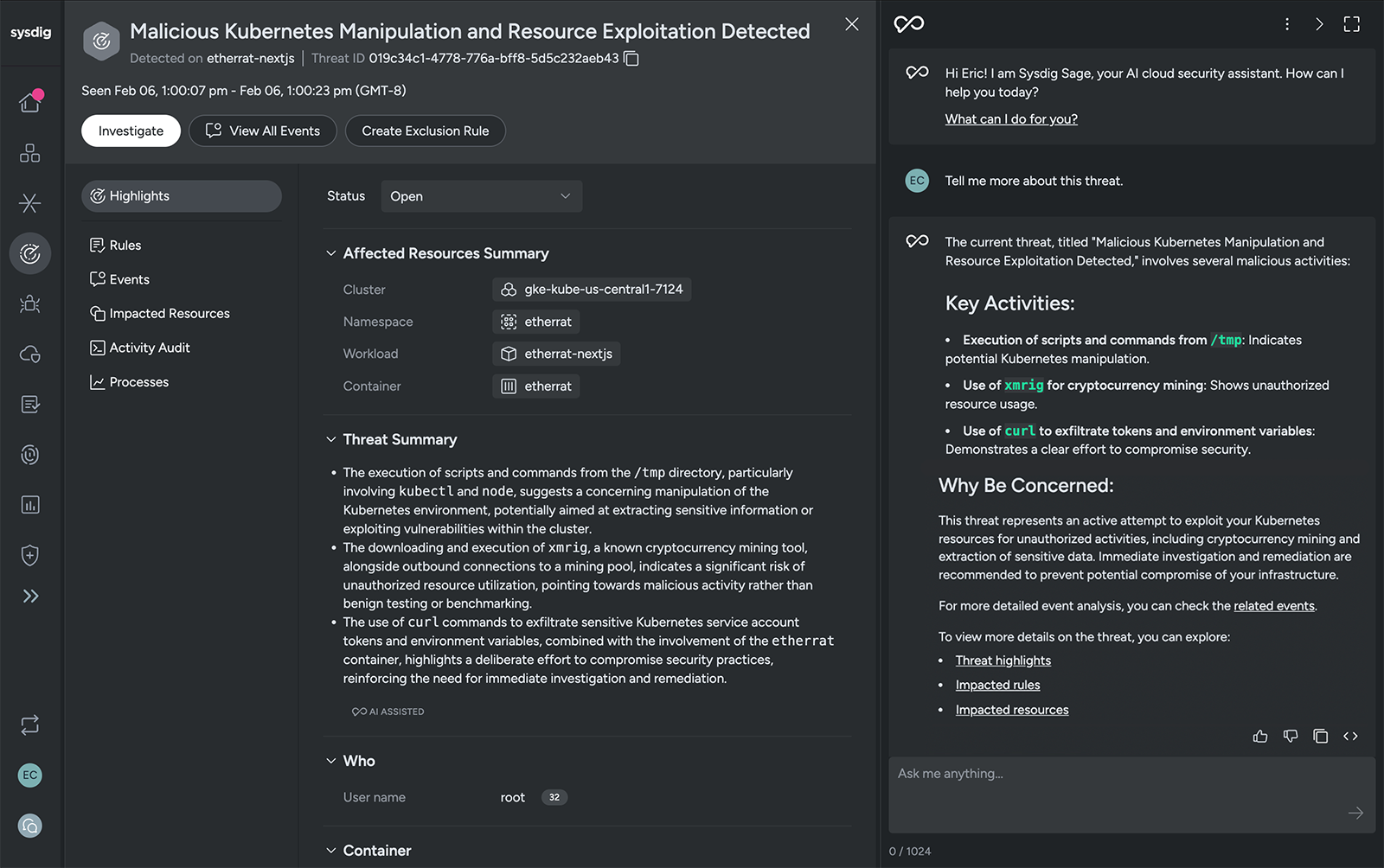 When you ask these types of questions about a threat, Sysdig Sage can: