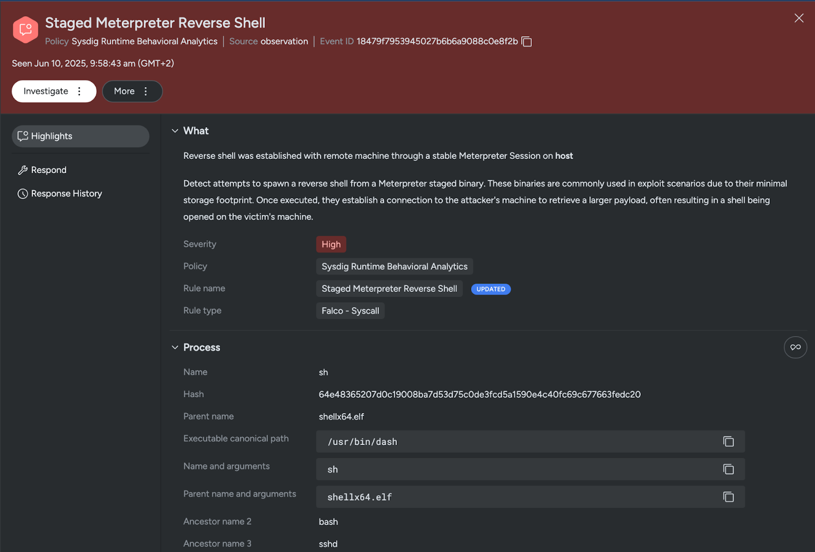 Sysdig is also able to detect this reverse shell category with multiple out-of-the-box rules, such as “Reverse Shell Spawned From Binary Through Pipes,” “Reverse Shell Spawned From Interpreted or Compiled Program Through Pipes,” “Staged Meterpreter Reverse Shell,” and others, depending on the involved syscalls and IPC abstractions.