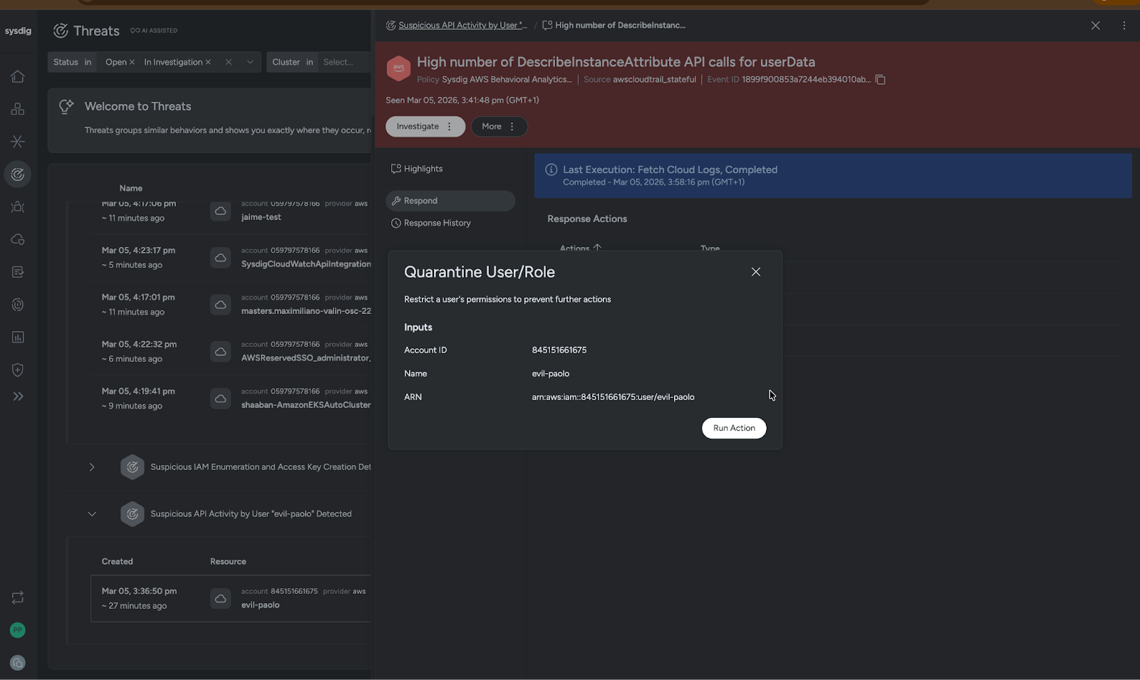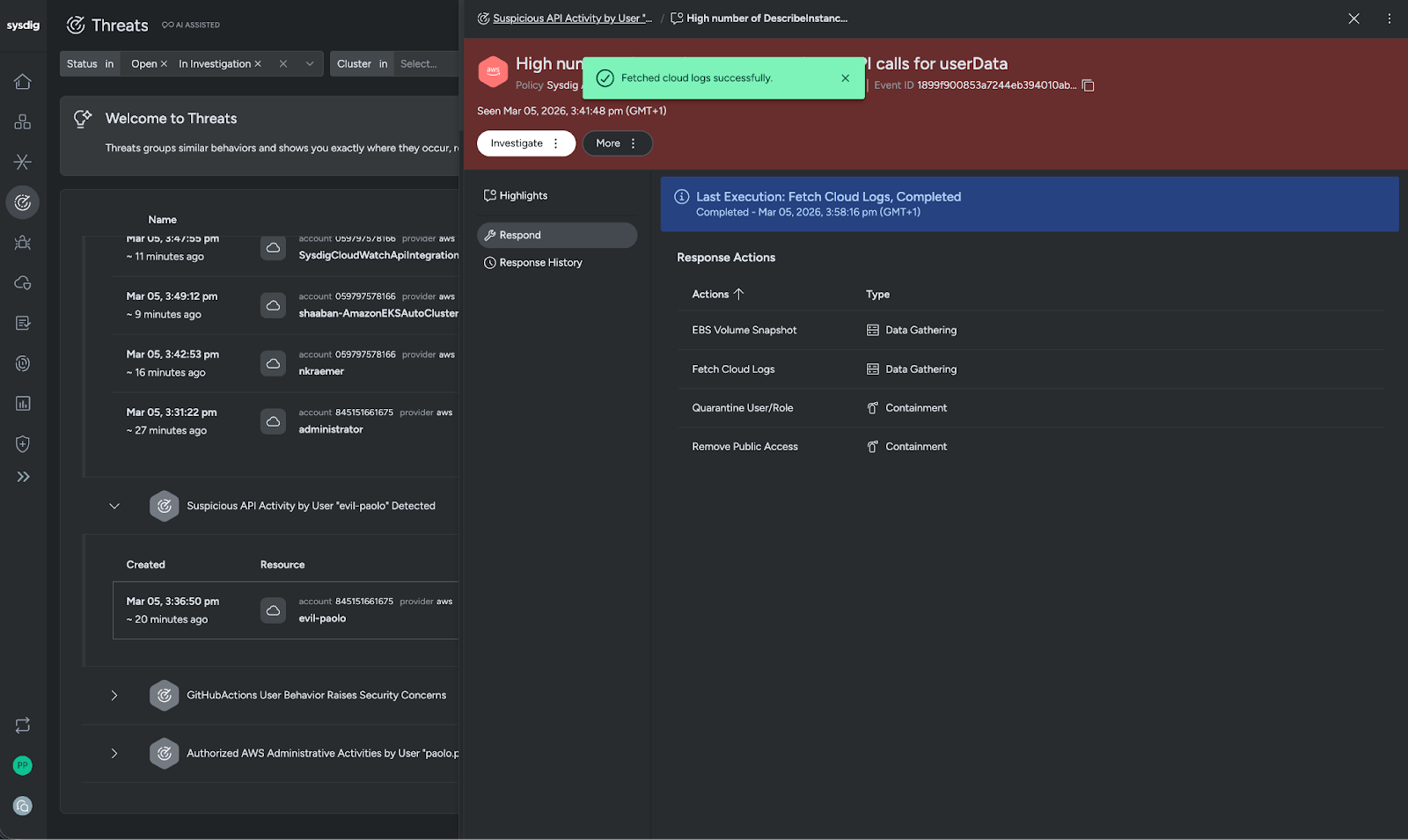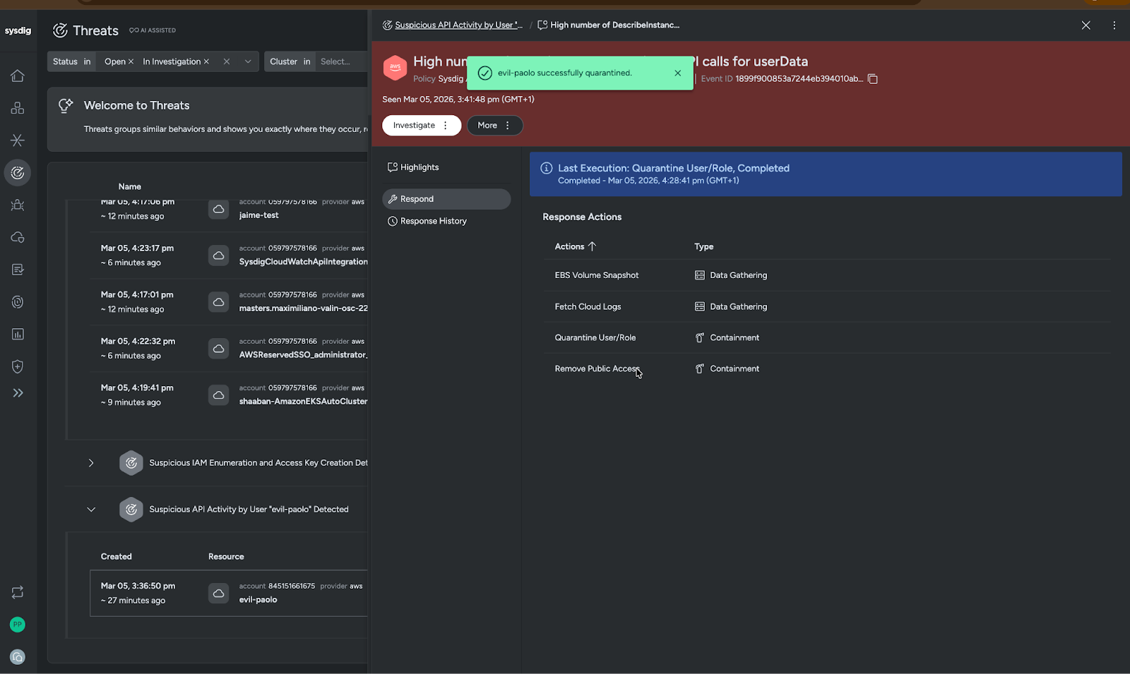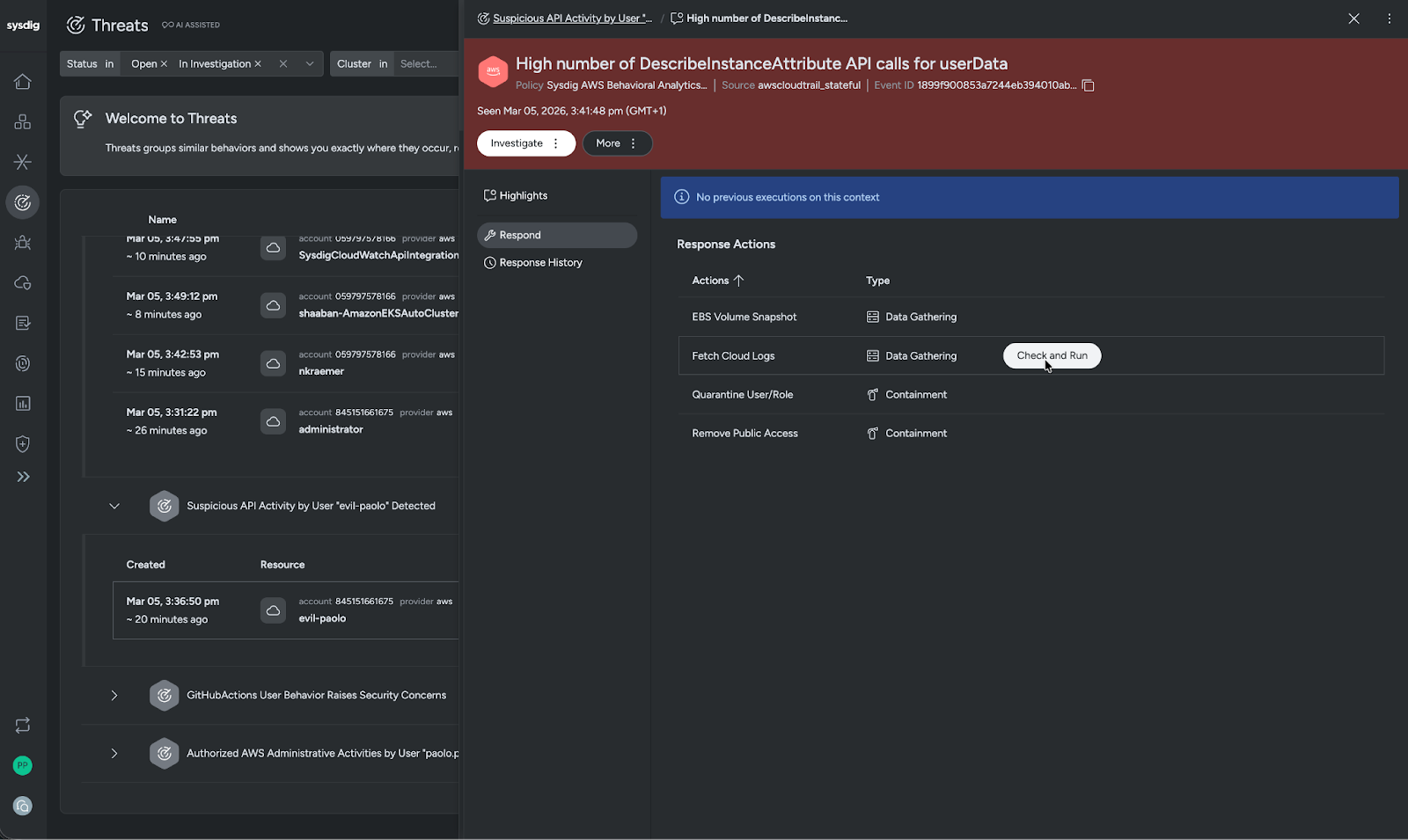 Sysdig’s Inline Cloud Response enables analysts to investigate and execute AWS-native containment actions directly from the Sysdig console, without switching tools or requiring additional access handoffs for predefined workflows.