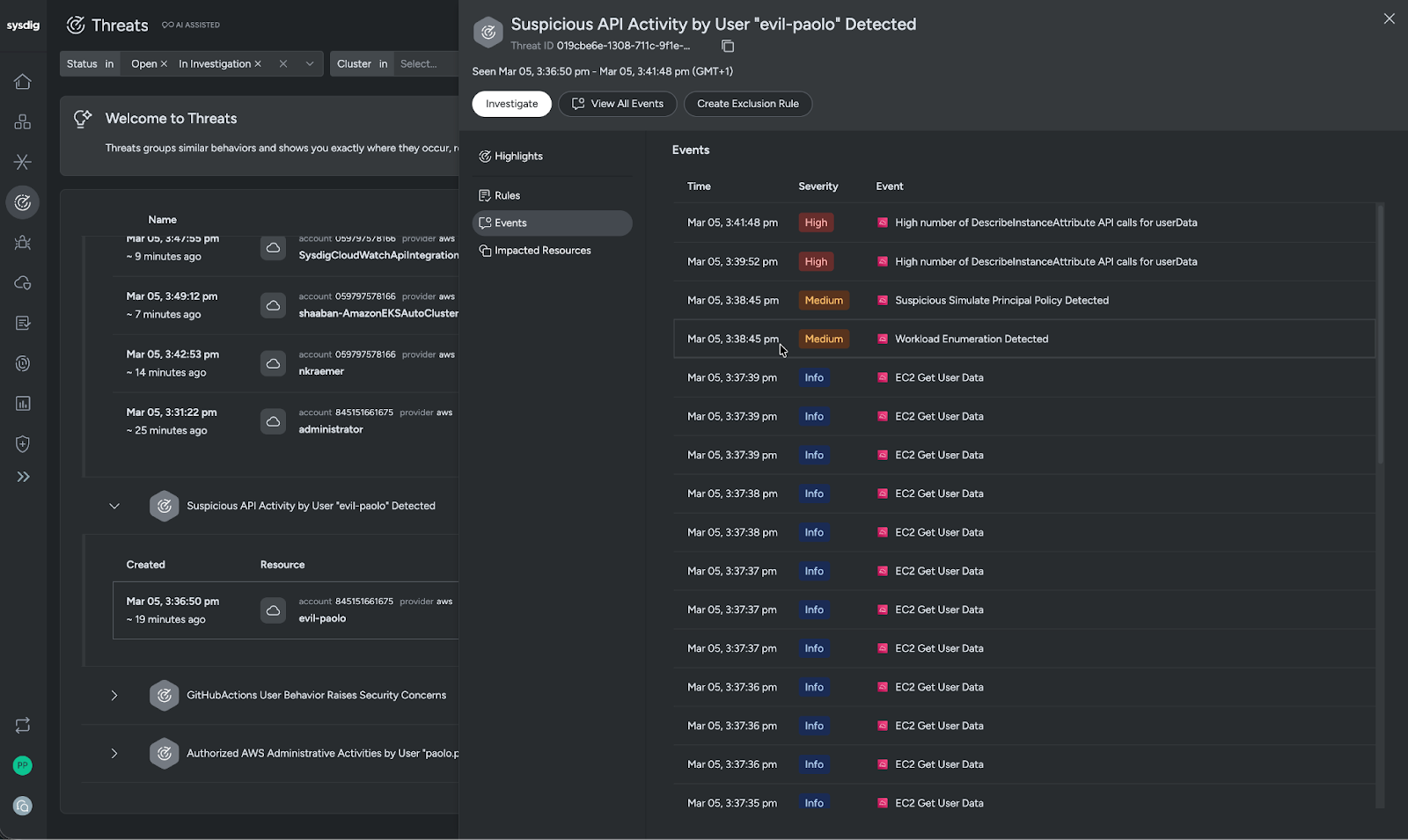 A new threat, Suspicious API Activity by User evil-paolo, shows up in the Sysdig Threats console. The threat summary tells us that user evil-paolo has engaged in extensive API activity, including multiple calls to DescribeInstanceAttribute and Get User Data. These could potentially be simple resource management, but the IP address combined with the detection of Suspicious Simulate Principal Policy with enumeration activities like ListClusters and ListTasks makes us suspect this may actually be a threat actor attempting to discover AWS resources.