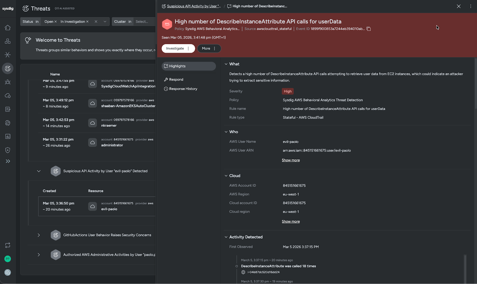Because of the sheer volume of activities, we are going to look through the highlights for priority signals. Here we can rapidly understand what is happening. In this case, it’s a high-severity detection based on Sysdig policy, AWS Behavioral Analytics. This stateful detection shows a rule triggered for a high number of DescribelnstanceAttribute API calls for userData. The highlights also show us who is behaving suspiciously, where they are behaving this way, and a timeline and description of the behavior volumes.