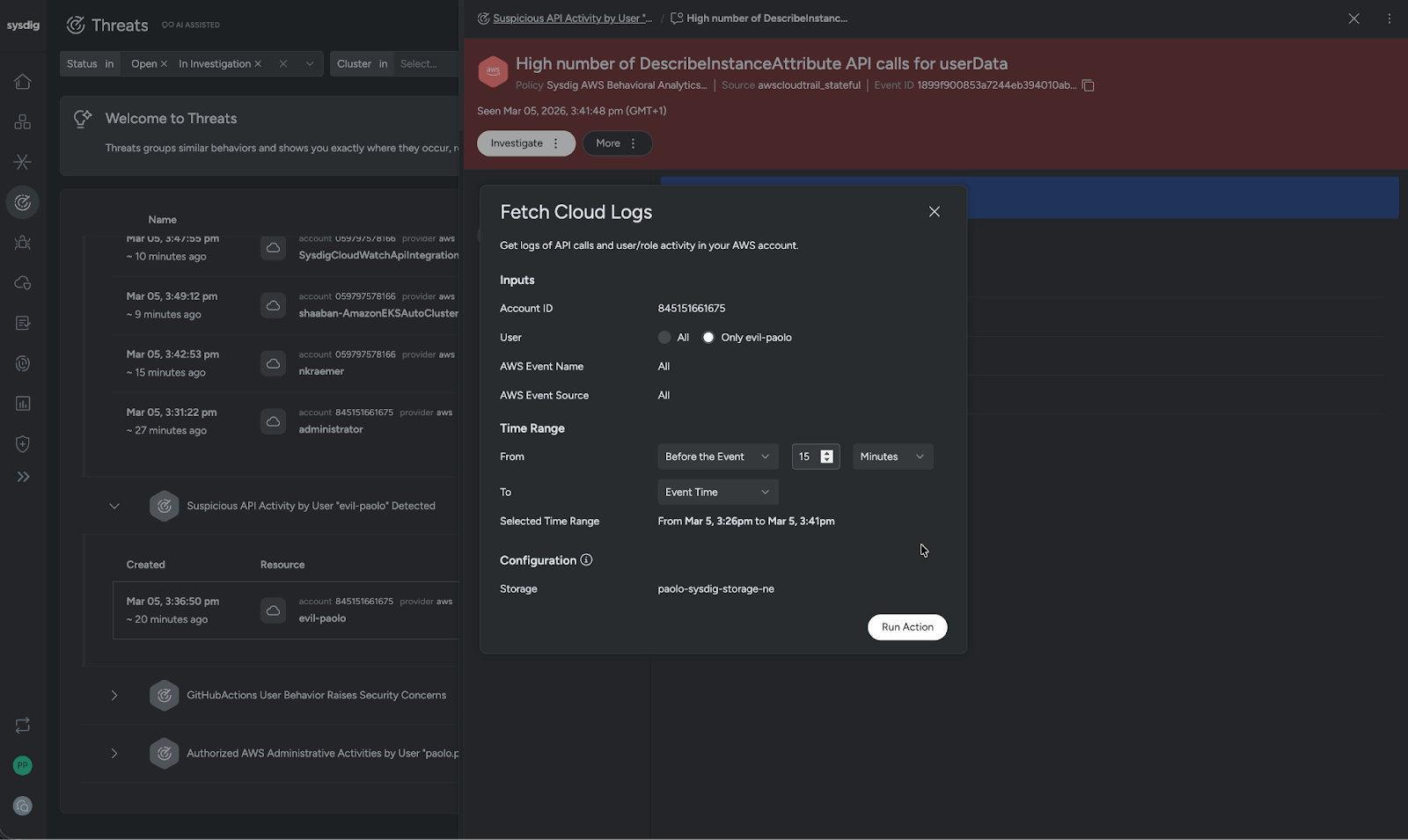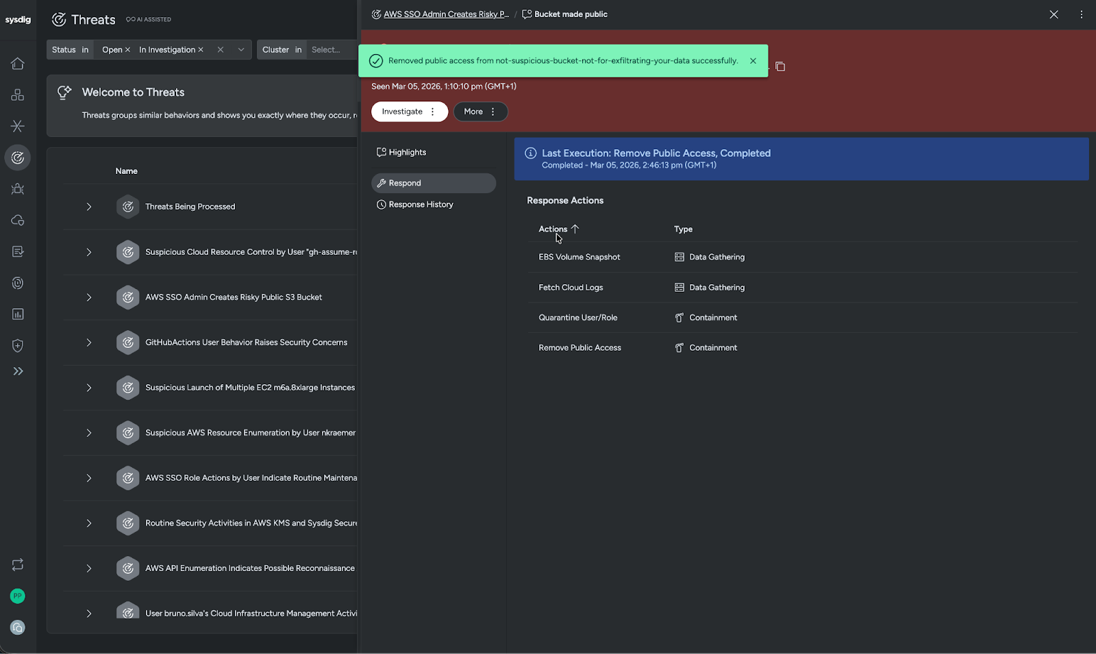 By enabling SOC and CSIRT teams to investigate and execute AWS-native response actions from the same interface, Sysdig reduces the MTTC, minimizes ownership ambiguity, and reduces unnecessary escalation loops. For security leaders, this translates into measurable improvements in incident response metrics, reduced exposure, and more empowered security teams operating within approved guardrails. All this in turn means teams can act decisively without additional console switching for approved response actions.