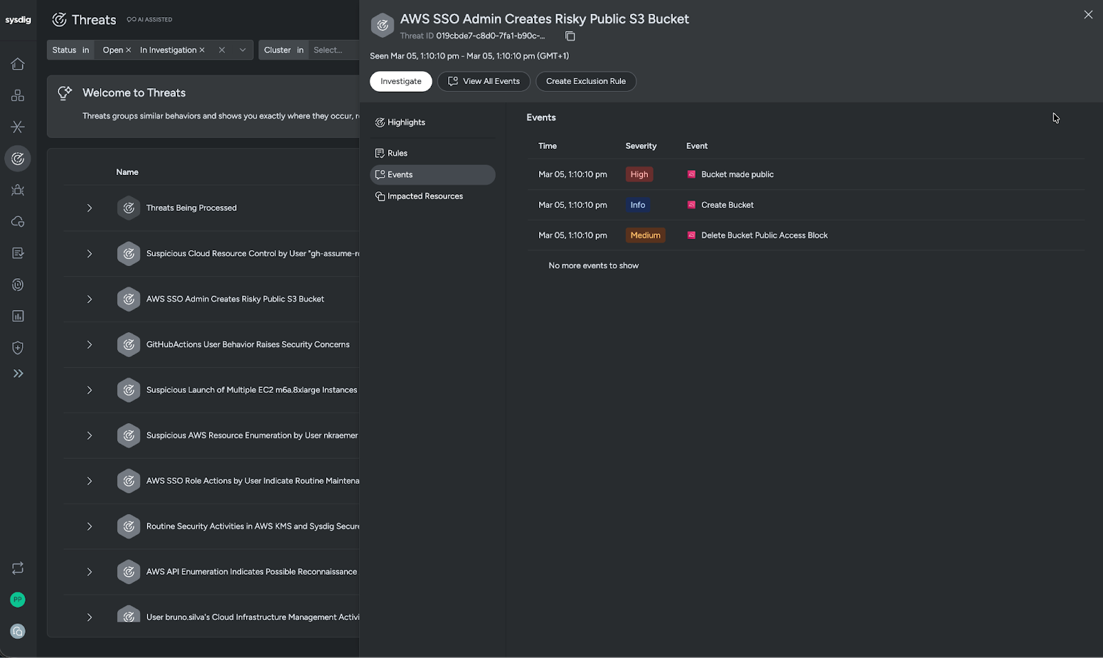 As we look above at the threat summary automatically generated by Sysdig Sage, we can see that a public S3 bucket was created and the public access block was deleted. This action along with the name suggest either a serious lapse in security best practices or a potential threat scenario. We know that in a worst-case scenario, this could essentially be a bad actor creating a bridge through which they can exfiltrate data from your organization.