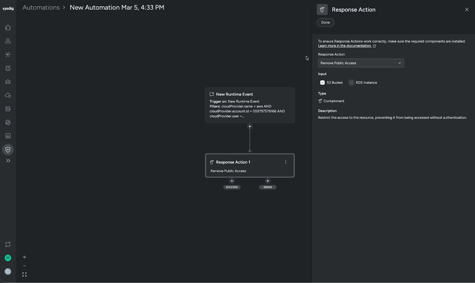 After stopping the attack, it's time to close the loop with blocking automations to stop attacks using this approach again in the future. In this scenario, we are using automations with automatic response actions against this behavior, specifically for the cloud provider, account ID, and user. Should these criteria be met, the automations will automatically block the action and remove public access.
