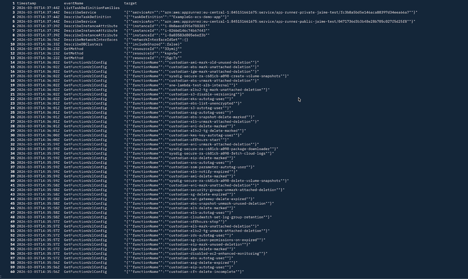 Under the highlights, we see bucket not-suspicious-not-for-exfiltrating-your-data was made public by AWSReservedSSO_administrator_c5ef97f9a91c4597 on region eu-central 1. We can later drill into that identity to see what else they have been up to.