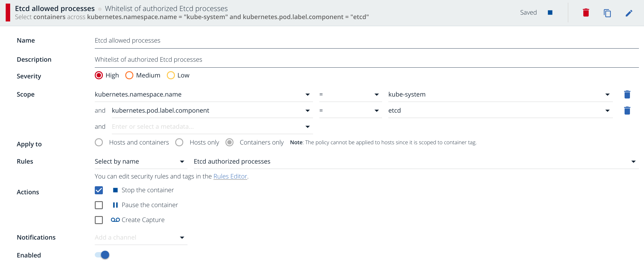 We wrote already on Sysdig Secure: Docker run-time security about the policy creation process more in detail. In a nutshell: you are restricting the scope of this rule to kubernetes.namespace.name=kube-system and Docker containers with the label component=etcd. This security violation is critical enough to stop the container immediately (see Actions) and of course, on a real scenario you will configure several notification channels, typically email or Slack but you can also go for webhooks, VictorOps, PagerDuty, etc.