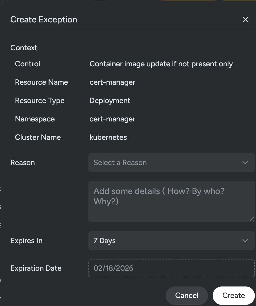 A more precise admission model allows exceptions to be scoped narrowly. Instead of disabling enforcement for an entire namespace, teams can define exceptions at a much more granular level. This can be as narrow as a single control finding for a single workload.