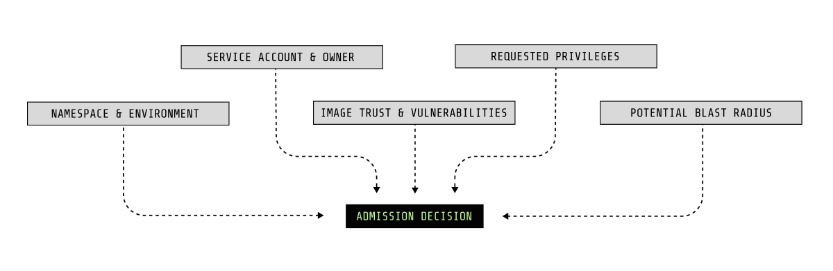By treating admission as a decision point rather than a static checklist, teams can move beyond binary enforcement. Posture can be aligned to workload identity, benchmark standards, and vulnerability risk. It is applied intentionally instead of uniformly.