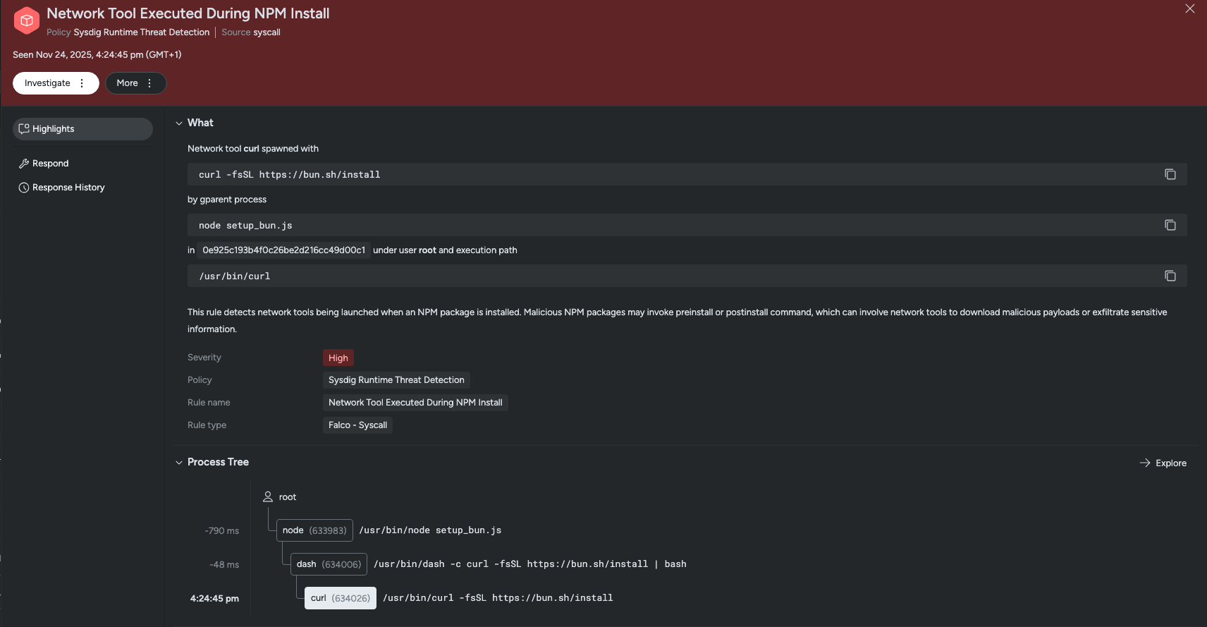 Sysdig Secure customers can leverage runtime detections with the Network Tool Executed During NPM Install and Instance Metadata Service Contacted During Package Install rules to detect Shai-Hulud. These rules can be found in the Sysdig Runtime Threat Detection policies. They flag suspicious connections and executions spawned from NPM install commands — in this case, from the payload bun_environment.js being executed.