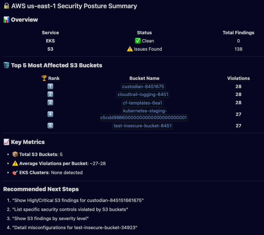 - If more details are needed, suggest next drill-downs (e.g. top 10 High/Critical findings).As the output, we can see that it shares a nice representation of our current posture by querying the Sysdig MCP: