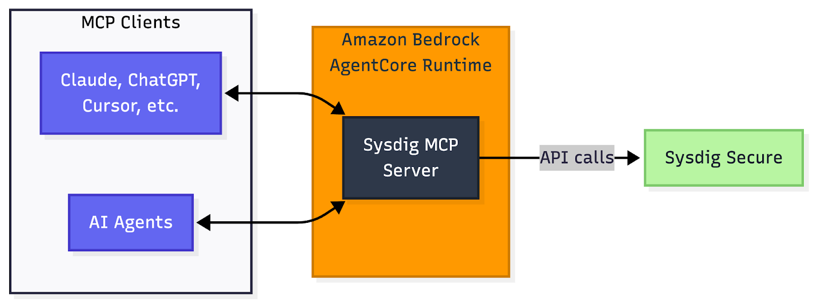 - Accelerated AI adoption: Deploy the Sysdig MCP server in minutes within the Amazon Bedrock AgentCore Runtime. This eliminates the need for custom "glue code," allowing you to point your AI agents directly at your security data via a native AWS experience.