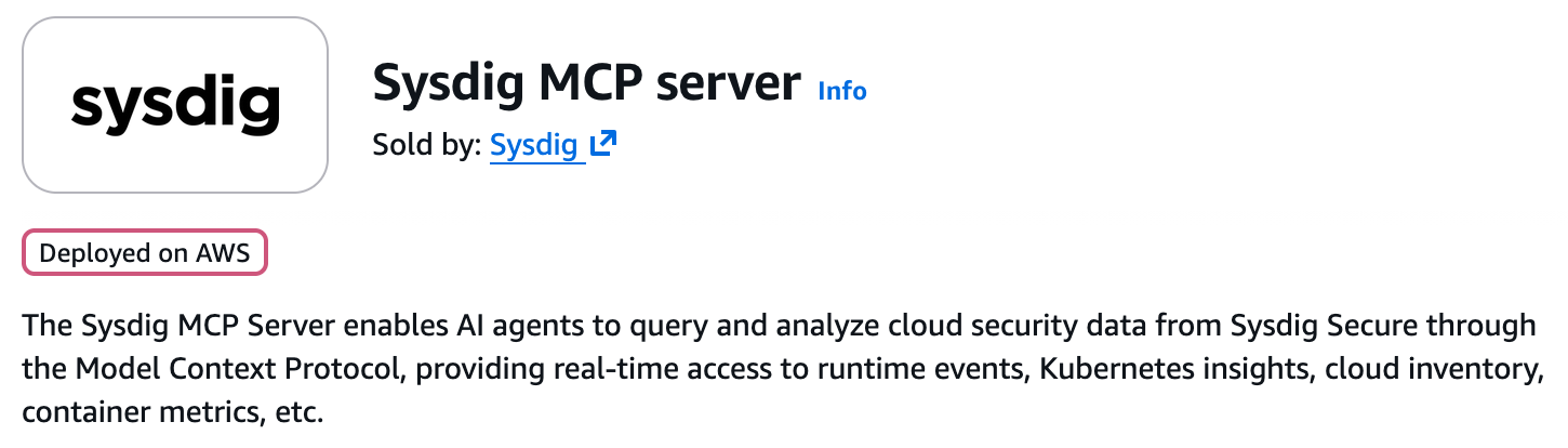 Ready to leverage these capabilities? Empower your AI agents with real-time security context by finding Sysdig in the AWS Marketplace AI Agents and Tools Category.