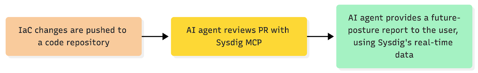 Shifting left is no longer a future state for organizations - it’s table stakes. This integration enables you to introduce security-aware AI into your existing CI/CD pipelines, which helps ensure that what goes into production meets your standards. Agents can automatically review pull requests or infrastructure-as-code (IaC) templates, using Sysdig’s real-time data to predict potential security regressions before they are deployed. This added layer of baked-in review helps eliminate risks without adding complexity or slowing down timelines.