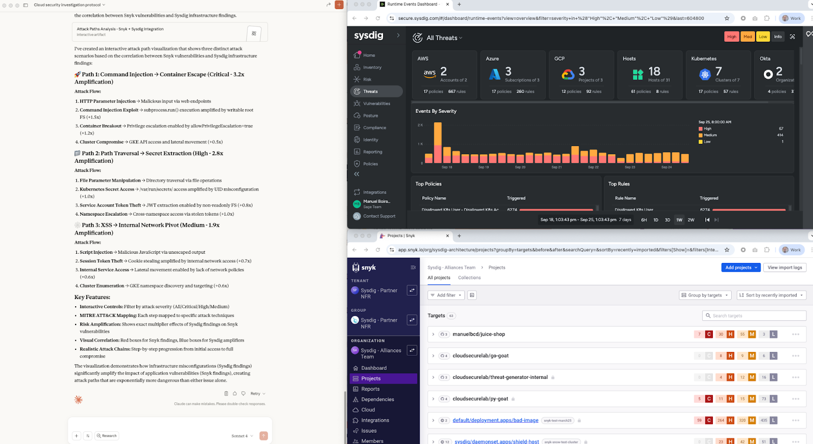 「snyk-vulnerability-list」と「sysdig-container-context」および「sysdig-risk」を相関させ、Snyk で報告された脆弱性とその攻撃経路が、Sysdig によって示された実際の構成やリスクの中でどのように悪用され得るかを能動的に調査します。重要なのは、両者を組み合わせて脅威を詳細にモデル化し、将来の攻撃者より先を行くことです。