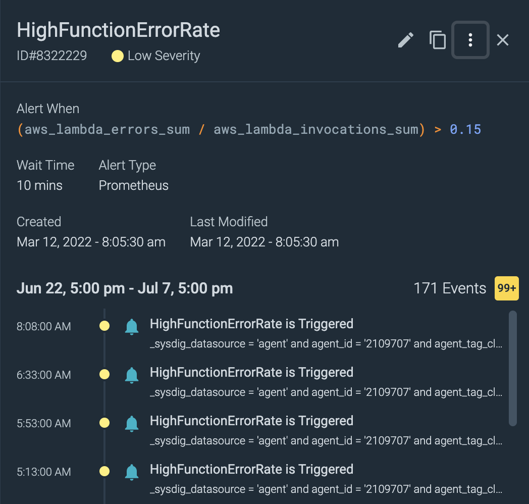 0.15" width="1048" height="998" data-lazy-srcset="https://sysdigcom.wpenginepowered.com/wp-content/uploads/AWS-CloudWatch-Stream-support_07.png 1048w, https://sysdigcom.wpenginepowered.com/wp-content/uploads/AWS-CloudWatch-Stream-support_07-350x333.png 350w, https://sysdigcom.wpenginepowered.com/wp-content/uploads/AWS-CloudWatch-Stream-support_07-768x731.png 768w, https://sysdigcom.wpenginepowered.com/wp-content/uploads/AWS-CloudWatch-Stream-support_07-175x167.png 175w, / 1w" data-lazy-sizes="(max-width: 1048px) 100vw, 1048px" data-lazy-src="https://sysdigcom.wpenginepowered.com/wp-content/uploads/AWS-CloudWatch-Stream-support_07.png" data-ll-status="loaded" sizes="(max-width: 1048px) 100vw, 1048px" srcset="https://sysdigcom.wpenginepowered.com/wp-content/uploads/AWS-CloudWatch-Stream-support_07.png 1048w, https://sysdigcom.wpenginepowered.com/wp-content/uploads/AWS-CloudWatch-Stream-support_07-350x333.png 350w, https://sysdigcom.wpenginepowered.com/wp-content/uploads/AWS-CloudWatch-Stream-support_07-768x731.png 768w, https://sysdigcom.wpenginepowered.com/wp-content/uploads/AWS-CloudWatch-Stream-support_07-175x167.png 175w, / 1w" />HighFunctionErrorRateのSysdig Monitorでのアラーム。(aws_lambda_errors_sum / aws_lambda_invocations_sum) > 0.15でアラート
