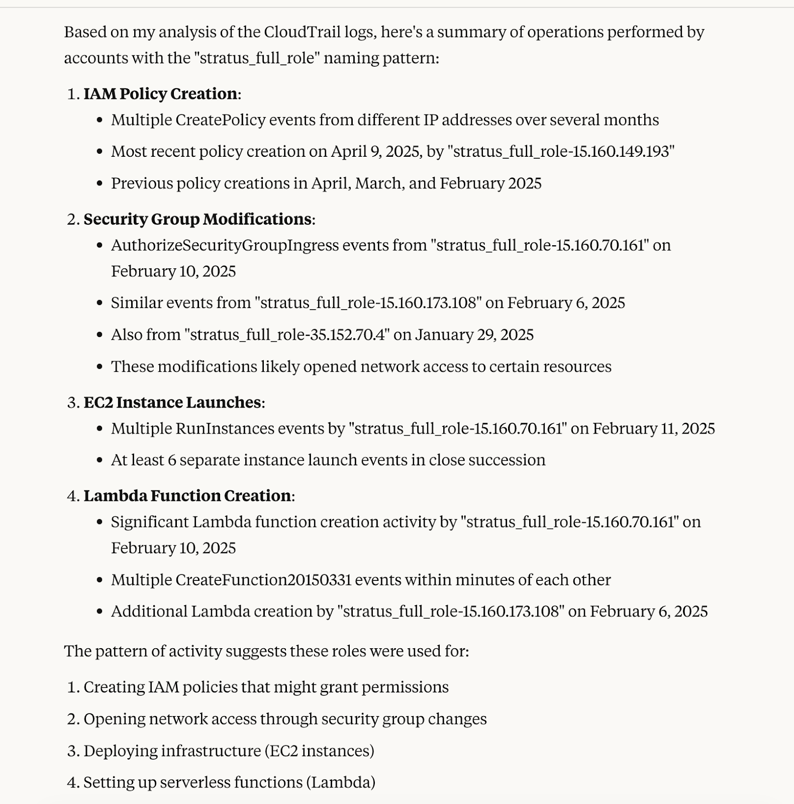 ここでは、 Stratus Red Teamを活用した敵対者エミュレーションテストを実施しました。LLM は次のように正しく指摘しました。