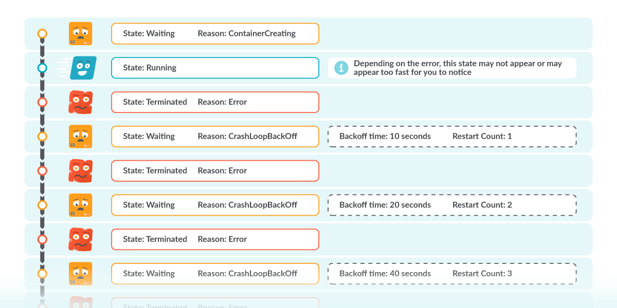 Kubernetesは、エラーを修正するチャンスを与えるために、再起動の間のバックオフ時間を長くして待機します。このように、CrashLoopBackOffはそれ自体がエラーではなく、Podが正しく起動できないようなエラーが起きていることを示しています。