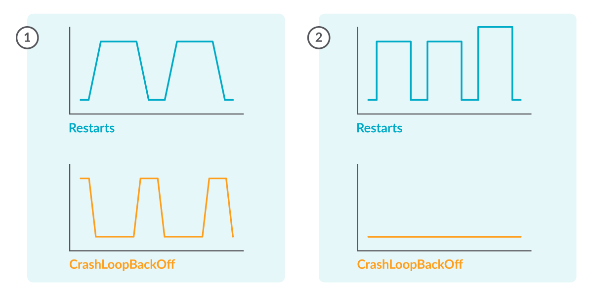 CrashLoopBackOffの期間ごとに再起動があるはずですが(1)、CrashLoopBackOffとは関係ない再起動がある可能性もあります(2)。