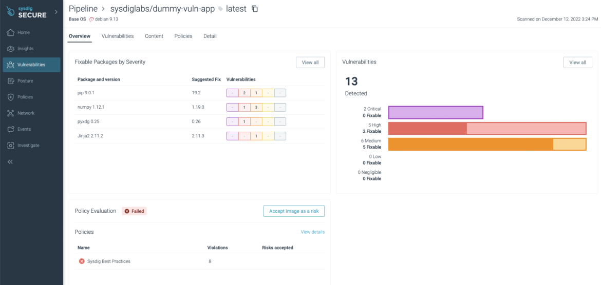 Sysdigの脆弱性管理は分散型で、アプリケーションのライフサイクル全体を柔軟に統合する一方、ポリシーを定義したりレポートを作成するための集中型ガバナンスを提供します。また、脆弱性のフィードバックループを常に提供し、修正に必要なすべてのコンテキストを開発者に分かりやすい方法で提供します(どのパッケージとバージョンを更新する必要があるか)。