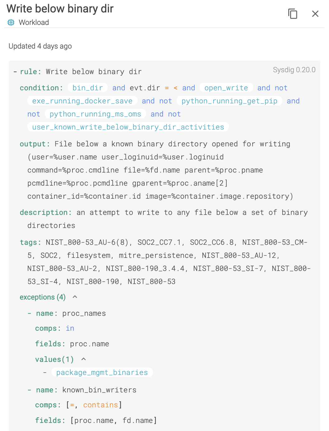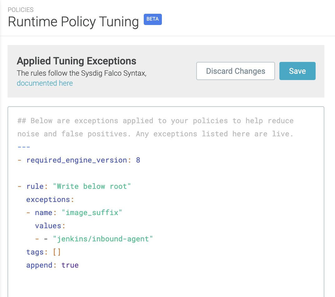 この機能をリリースする前は、ルールエディターで作成した例外は、ルールの条件に付加されていました。そのために、ルールの最後にand not macro_nameを使用していました。これは基本的に、無視したいオブジェクトのリストにマッチする条件に過ぎませんでした。例えば、Jenkins のジョブを実行する際に、docker デーモンをマウントするコンテナを無視したい場合があります。- macro: docker_proc