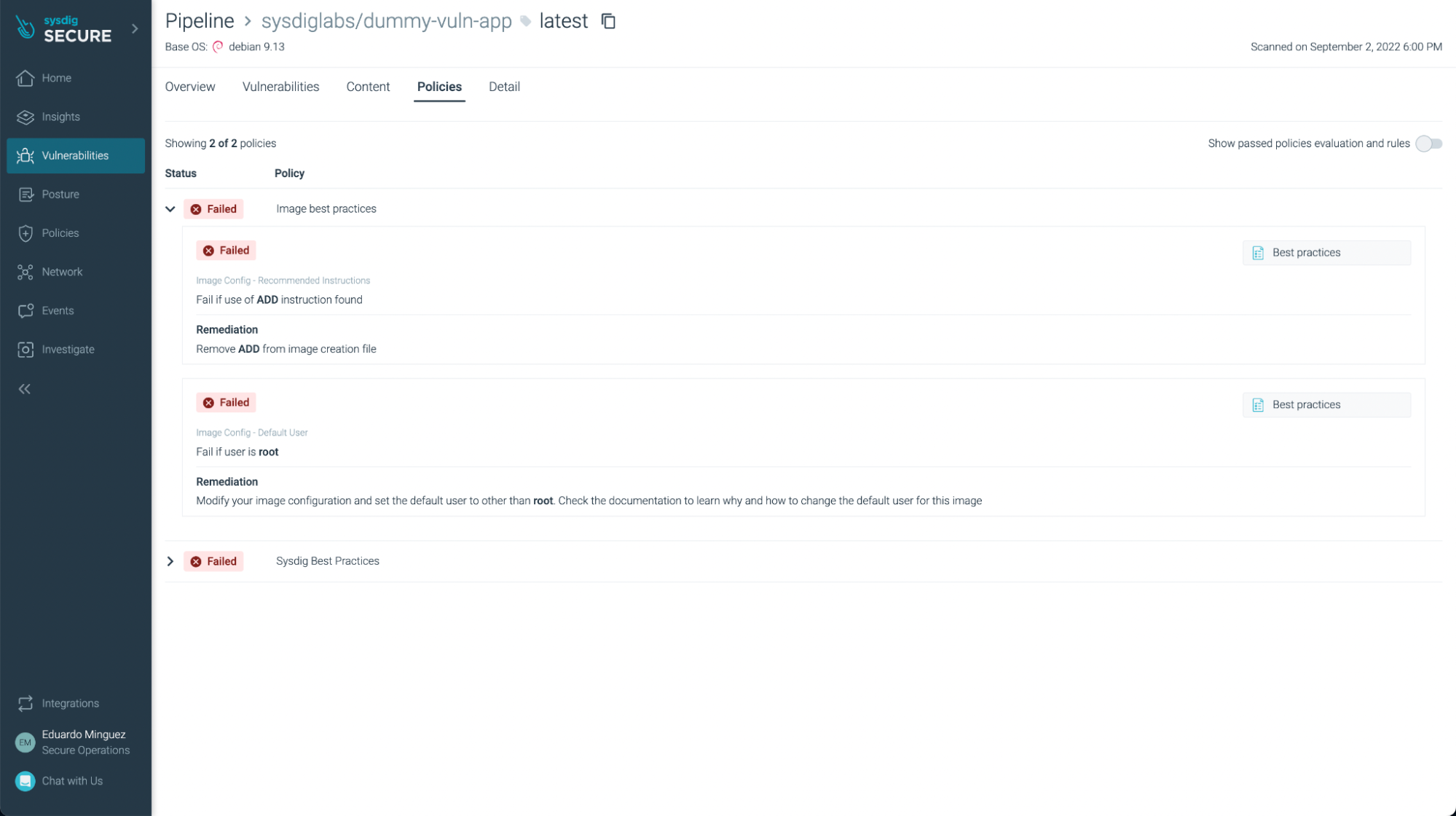 このスキャン例では、デフォルトの “Sysdig Best Practices” ポリシーを使用しましたが(ログで確認できます)、脆弱性ポリシーだけでなく、イメージのベストプラクティスなど、チェックしたいポリシーを作成し、カスタマイズすることも可能です。