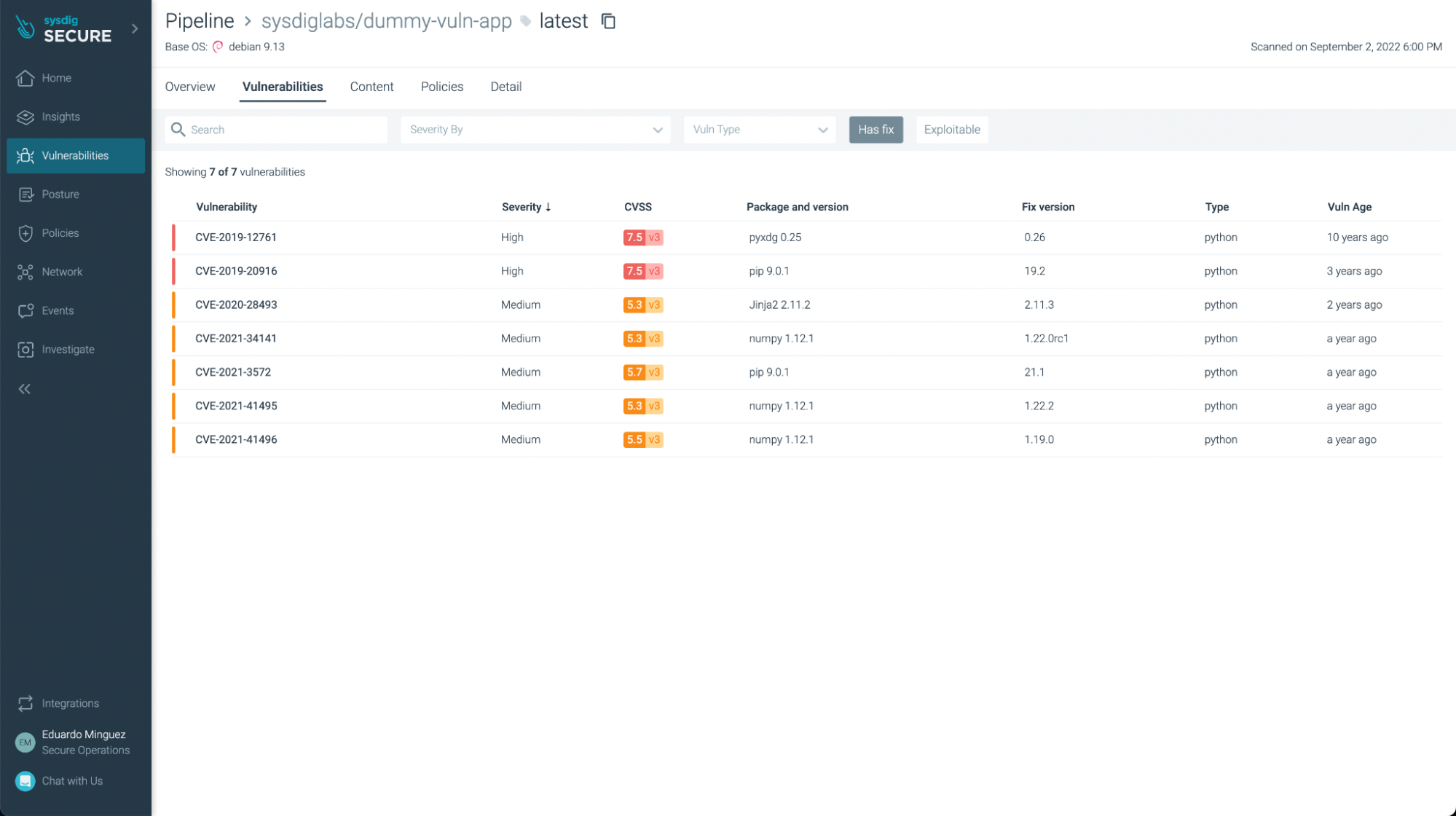 この例では脆弱性は発見されませんでしたが(やった!)、https://github.com/sysdiglabs/dummy-vuln-app のような別のアプリケーションを見ると、いくつか発見されていることがわかります。