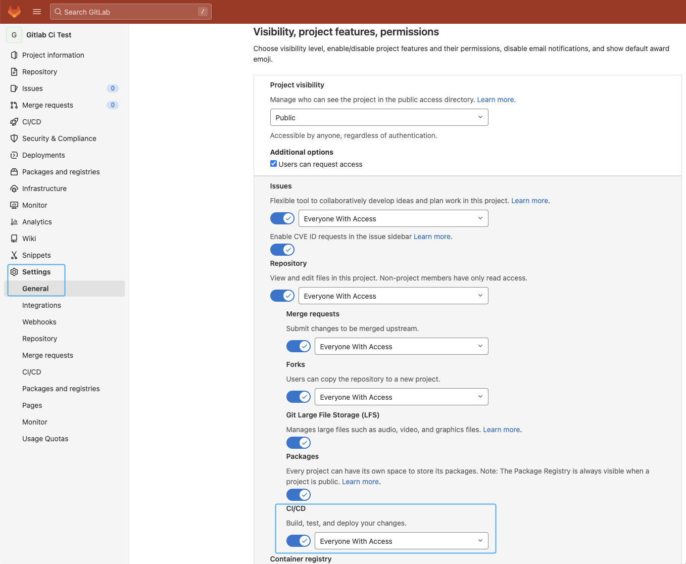 GitLab CI/CDは、デフォルトですべての新しいプロジェクトで有効になっていますが、もしあなたのリポジトリでGitLab CI/CDを有効にしていないなら、最初のステップは、それが有効になっていることを確認することです。リポジトリの設定、CI/CDセクション(https://gitlab.com/<user>/<repository>/edit)に移動し、“Visibility, project features, permissions” セクションを展開し、“CI/CD”トグルがアクティブであることを確認します: