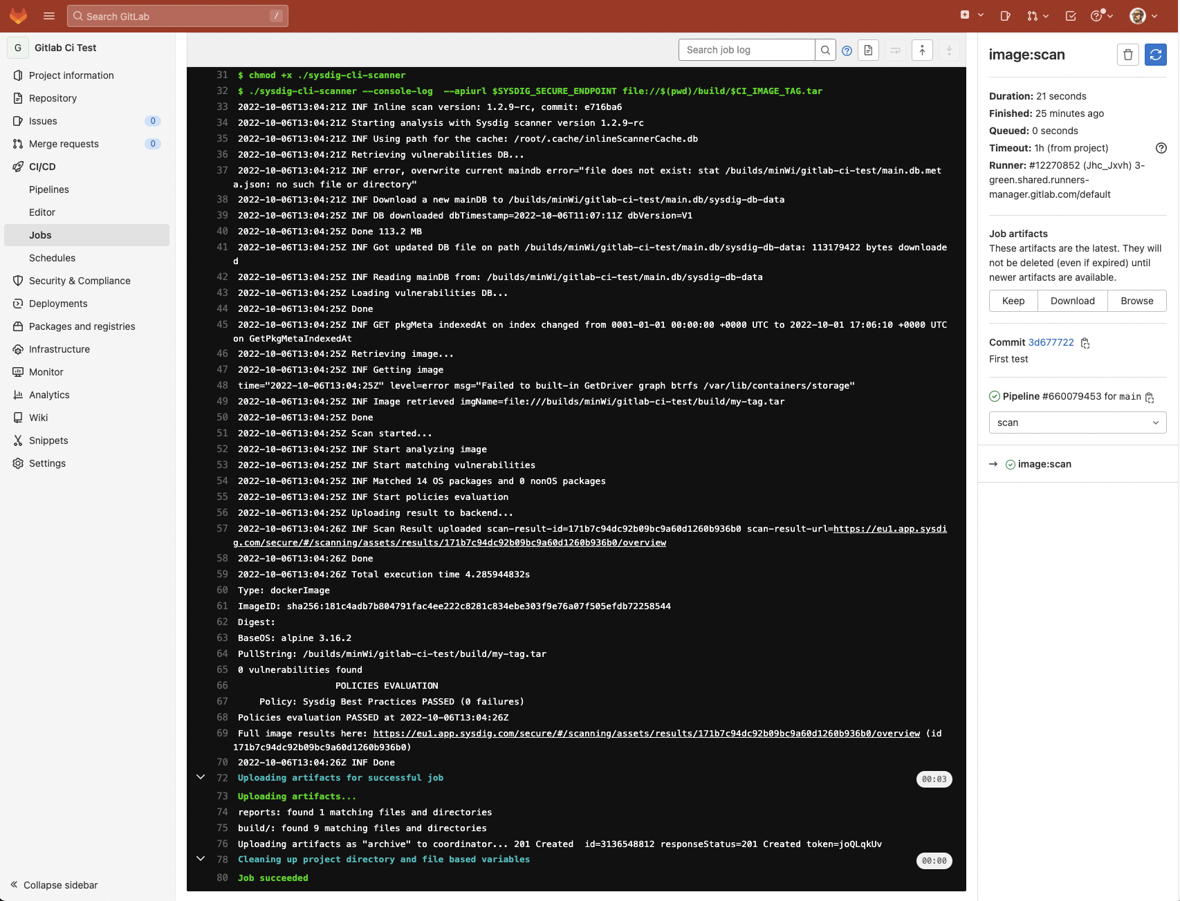 このように、GitLab CI/CDは、GitLabリポジトリ上で直接CI/CDパイプラインを自動化するための強力なツールです。Sysdig Secure Inline Scanをワークフローに組み込むことは簡単で、イメージの脆弱性をスキャンし、ビルド時にベストプラクティスを実施し、レジストリ内の旧来のイ メージスキャンと比較していくつかの利点を提供することができるようになりました。