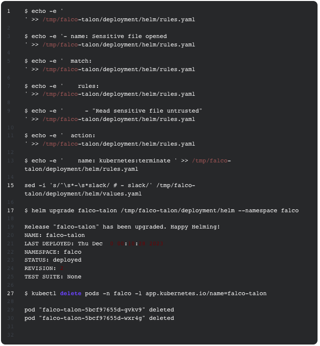 1 – 次に、 /tmp/falco-talon/deployment/helm/rules.yaml ファイルに一連の行をエコーします。Talonルールの名前を指定する必要があります(これは任意の名前です)、一致させたいFalcoルールを指定します(これはFalcoルールの特定の名前です)、そして一致した場合に取るアクションを指定します。この場合、ポッドを終了させます。