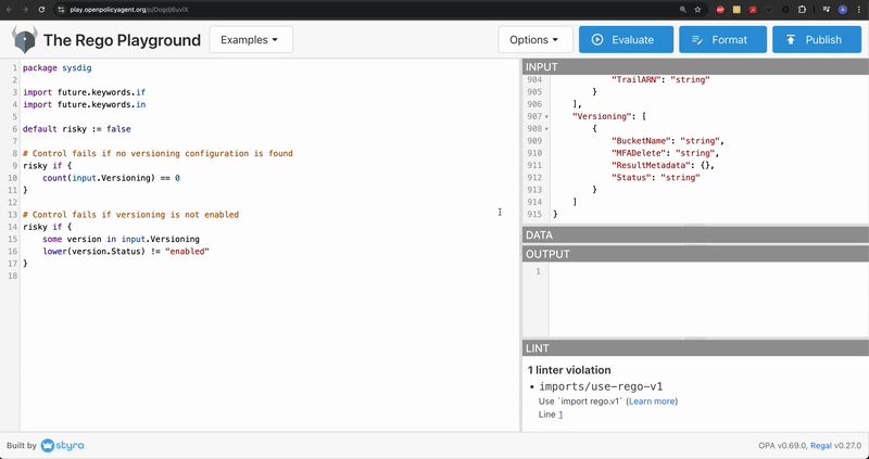 スクリプトを再度評価し、OUTPUTウィンドウで risky が false に変わることを確認してください。これにより、Regoロジックが正しく機能していることが証明されます。