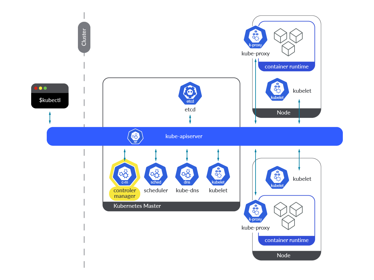 Kube-controller-managerは、異なるKubernetesコントローラのコレクションで、すべてのコントローラーがバイナリーに含まれ、ループ内で永続的に実行されます。その主なタスクは、オブジェクトの状態の変化を監視し、実際の状態が新しい目的の状態に向かって収束することを確認することです。要約すると、Kubernetesオブジェクトの状態にまつわる調整作業を担当しています。