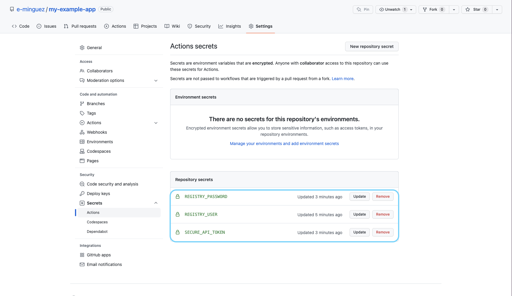 レジストリパスワードや API トークンのような機密データについては、 repository Settings -> Secrets -> Actions -> “New repository secret” で、リポジトリのsecretsを作成することをおすすめします。