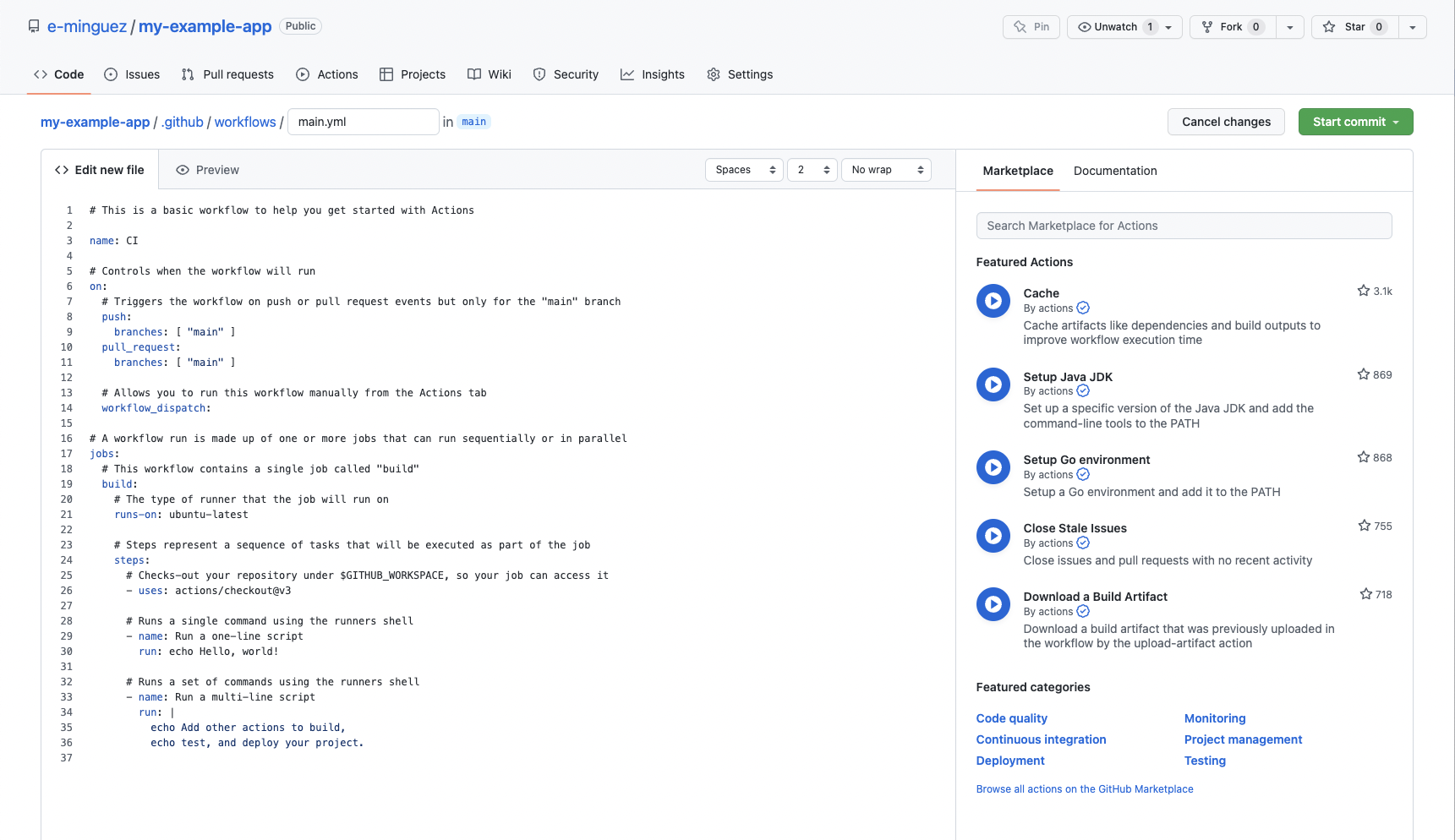 デフォルトの main.yml を build-scan-and-push.yaml のような適切な名前に変更し、組み込みエディタでワークフローの YAML を編集して次のステップを使用するようにしましょう:env: