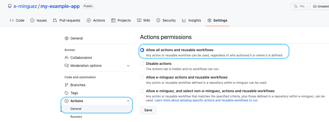 そこで、すべてのアクションと再利用可能なワークフローを許可するオプションが選択されていることを確認します: