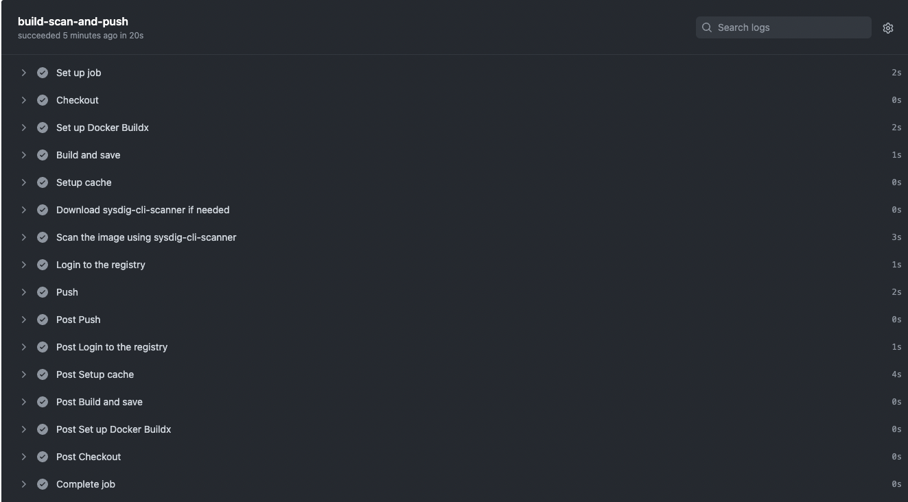 GitHub Actions は、GitHub リポジトリ上で CI/CD パイプラインを直接自動化するための強力なツールです。Sysdigコンテナのイメージスキャン機能をワークフローに組み込むことは簡単で、イメージの脆弱性をスキャンし、ビルド時にベストプラクティスを適用することで、レジストリ内の従来のイメージスキャンよりもいくつかの利点を提供することができます。