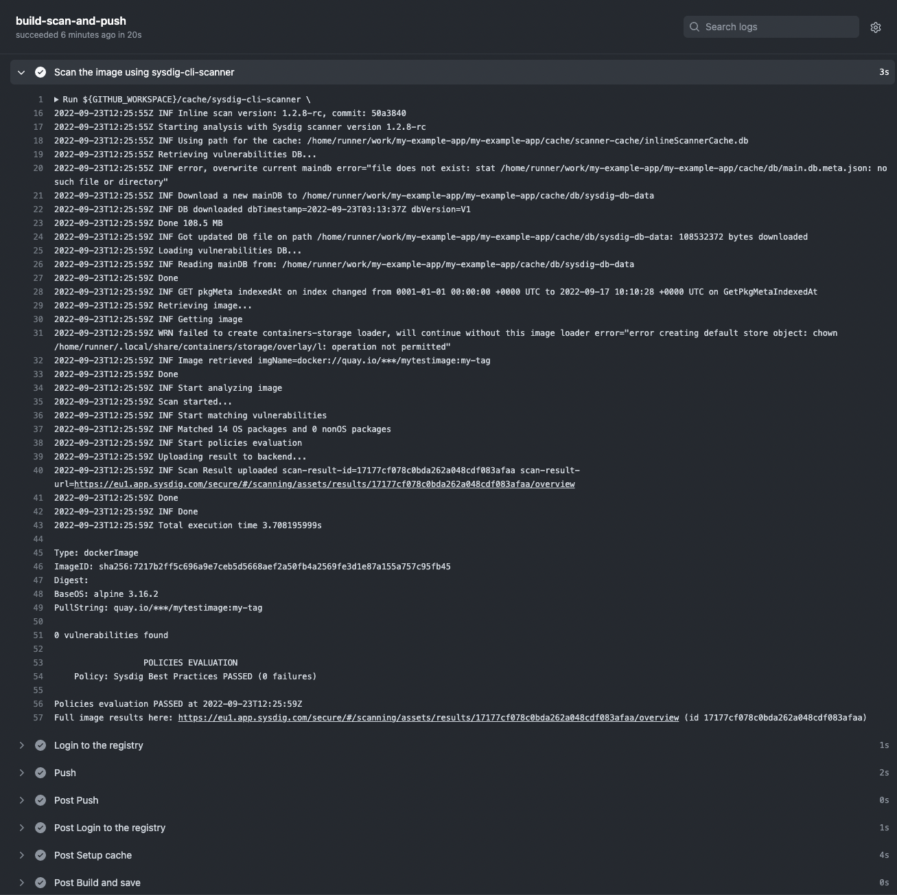 --apiurl ${SYSDIG_SECURE_ENDPOINT}: スキャン結果の送信先、およびデータベースのダウンロード先となるSysdig APIのエンドポイントです。docker://${REGISTRY_HOST}/${{ secrets.REGISTRY_USER }}/${IMAGE_NAME}:${IMAGE_TAG}前のステップでビルドされ、コンテナキャッシュにローカルに保存されたコンテナイメージです。- --dbpath=${GITHUB_WORKSPACE}/cache/db/ : 脆弱性データベースを格納するパスです(詳細は後述)。