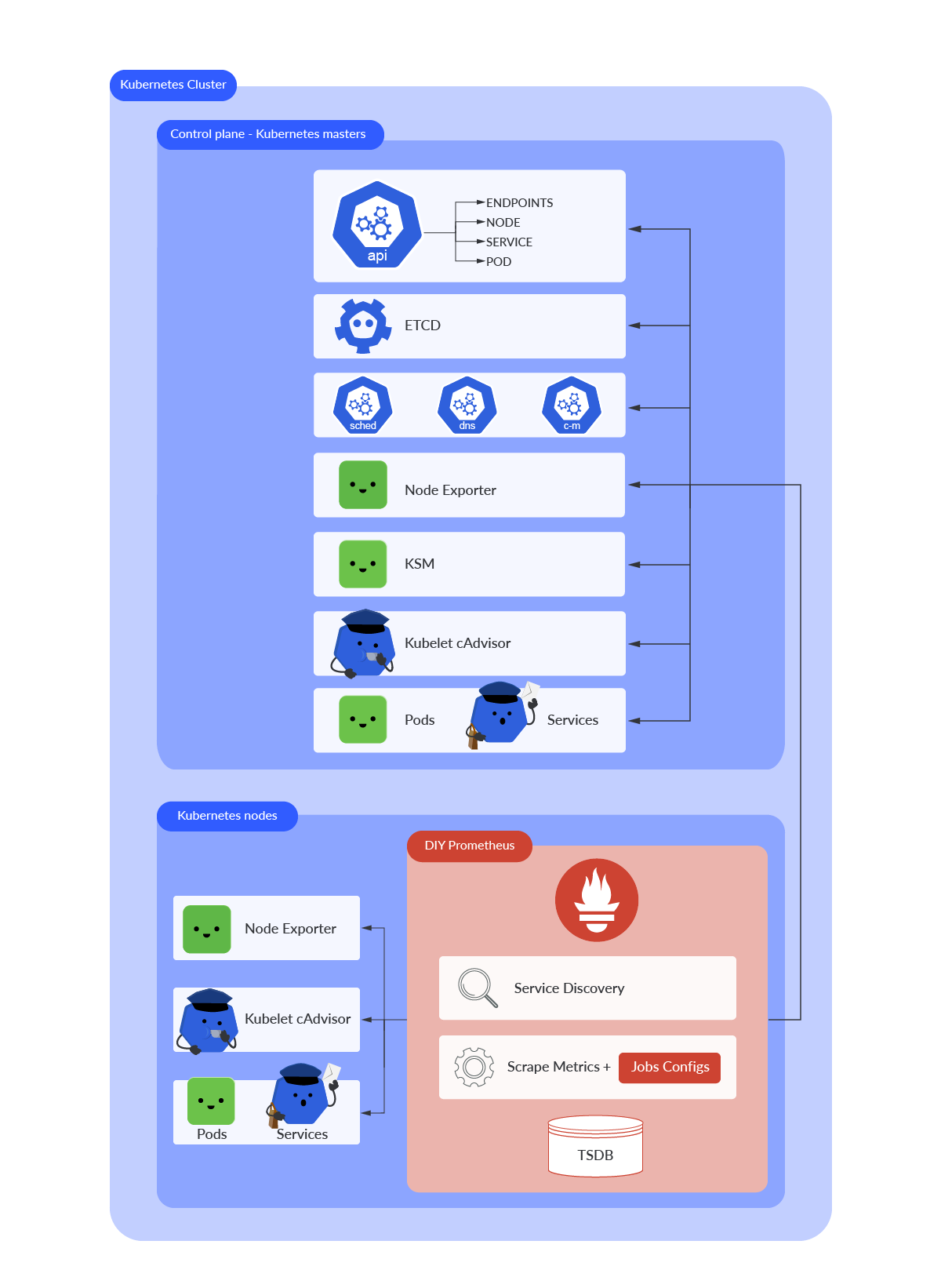 Kubernetesを監視する場合、DIYのPrometheusインスタンス以外に、いくつかのものが必要です。ノード、コンテナ、Kubernetesオブジェクトの状態に関するメトリクスやデータを取得したい場合、いくつかのエクスポーターをデプロイする必要があります。Prometheusは、独自のサービス・ディスカバリーによって発見された後、これらのターゲットからメトリクスをスクレイピングし始めます。