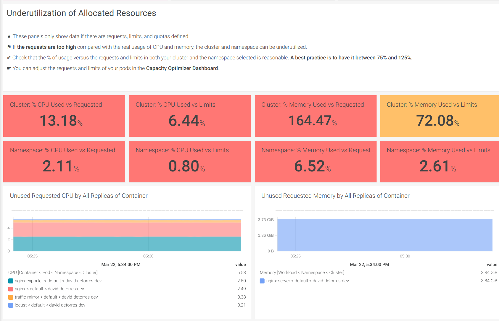 「Underutilization of Allocated Resources」ダッシュボードでは、使用されていないCPUやメモリがあるかどうかを確認できます。