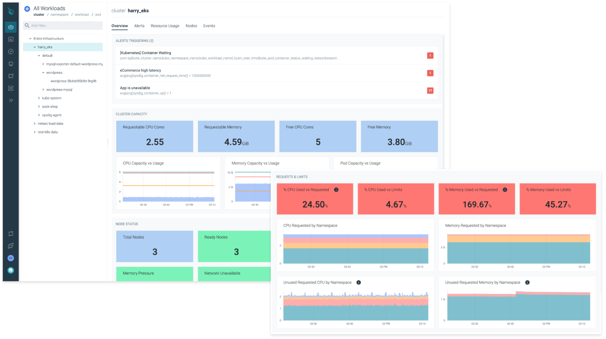 クラスターキャパシティの健全性を迅速に監視し、ワークロードのリソース状況を確認することができます。