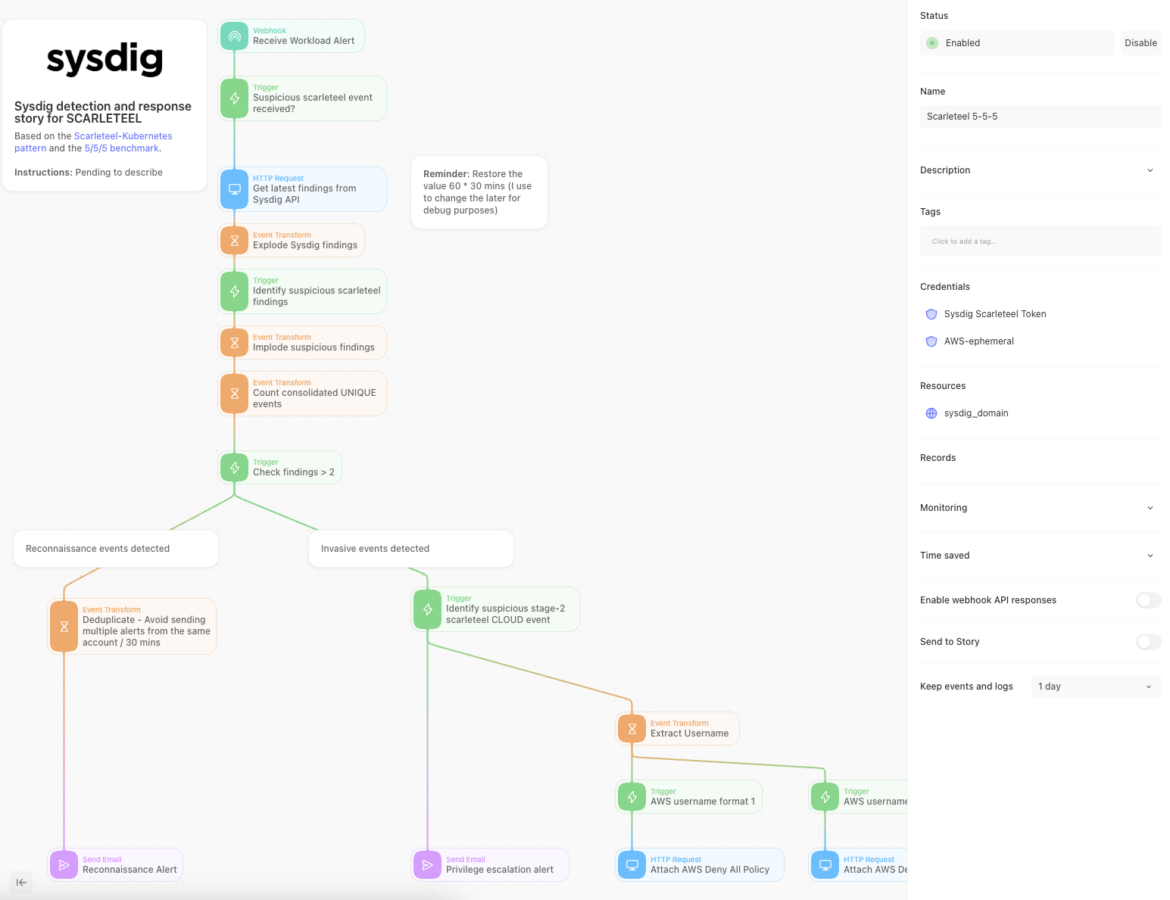 ここまでは順調ですね。では、Sysdig と Tines は、Scarleteel のような最も複雑で最新のセキュリティ攻撃の検出と対応にどのように役立つでしょうか?